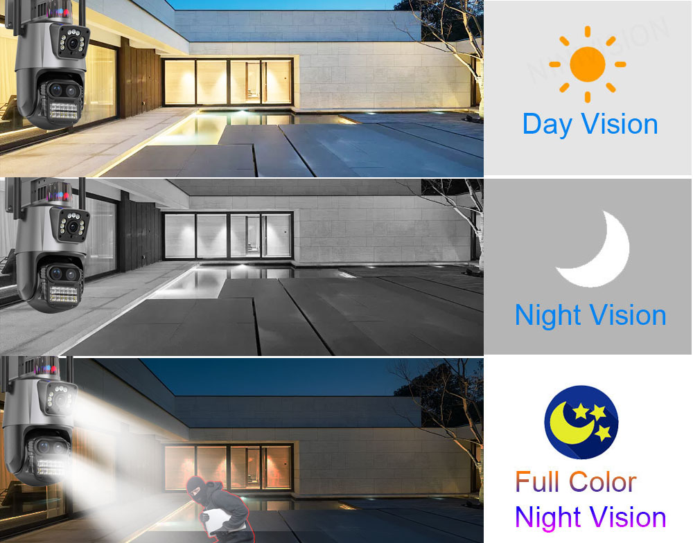 Когда белый светодиодный светильник, камера будет отображать красочное видение ночью, и вы можете выбрать три ночных режима.