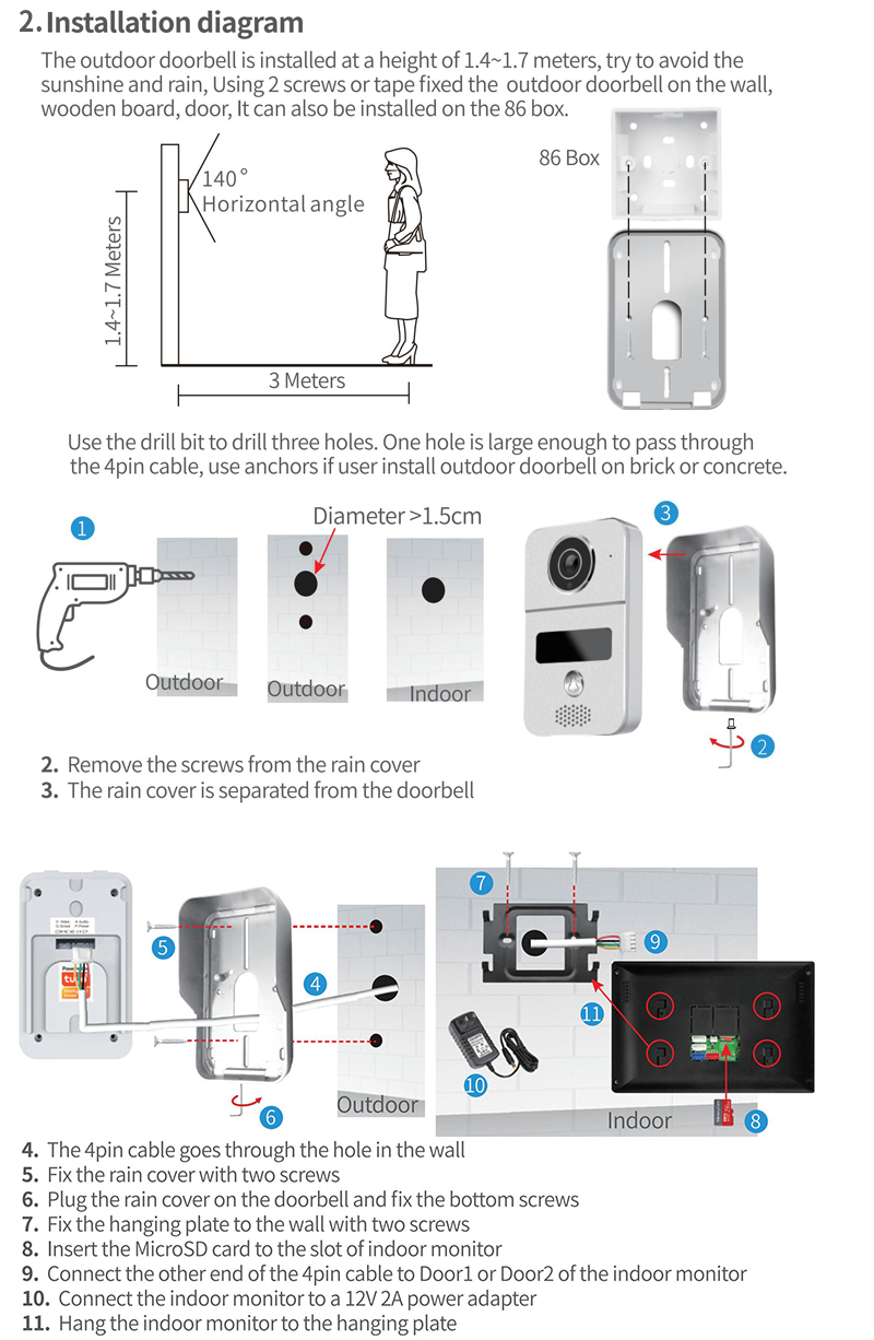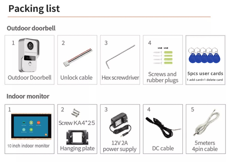 4. Адаптер питания: наружный дверной звонок и внутренний монитор используют адаптер питания 12 В 2 А