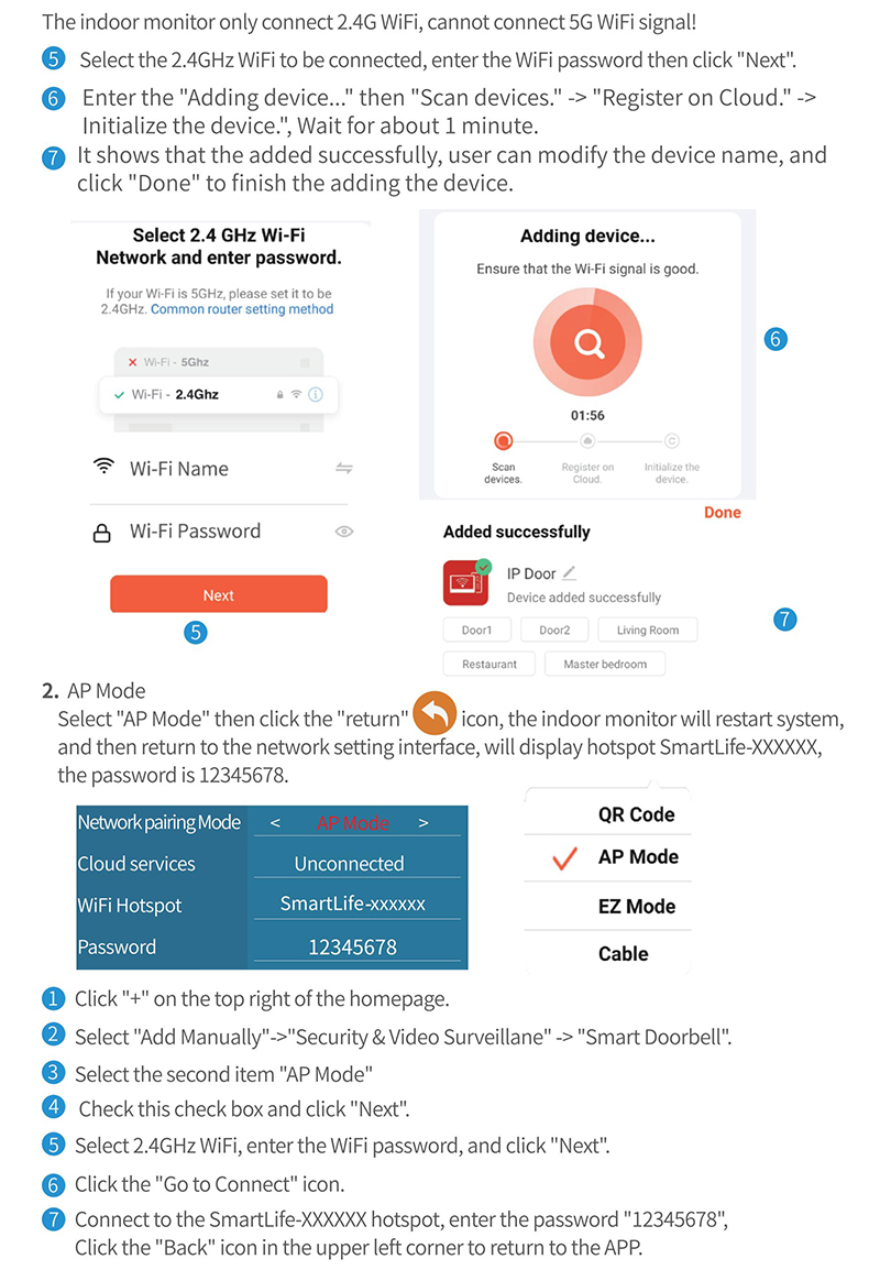 Видеодомофон Wi-Fi не означает, что вам не нужен кабель. Монитор поддерживает сеть Wi-Fi (подключается только к диапазону маршрутизатора 2,4 GHZ), но внутренний монитор и дверной звонок подключены.