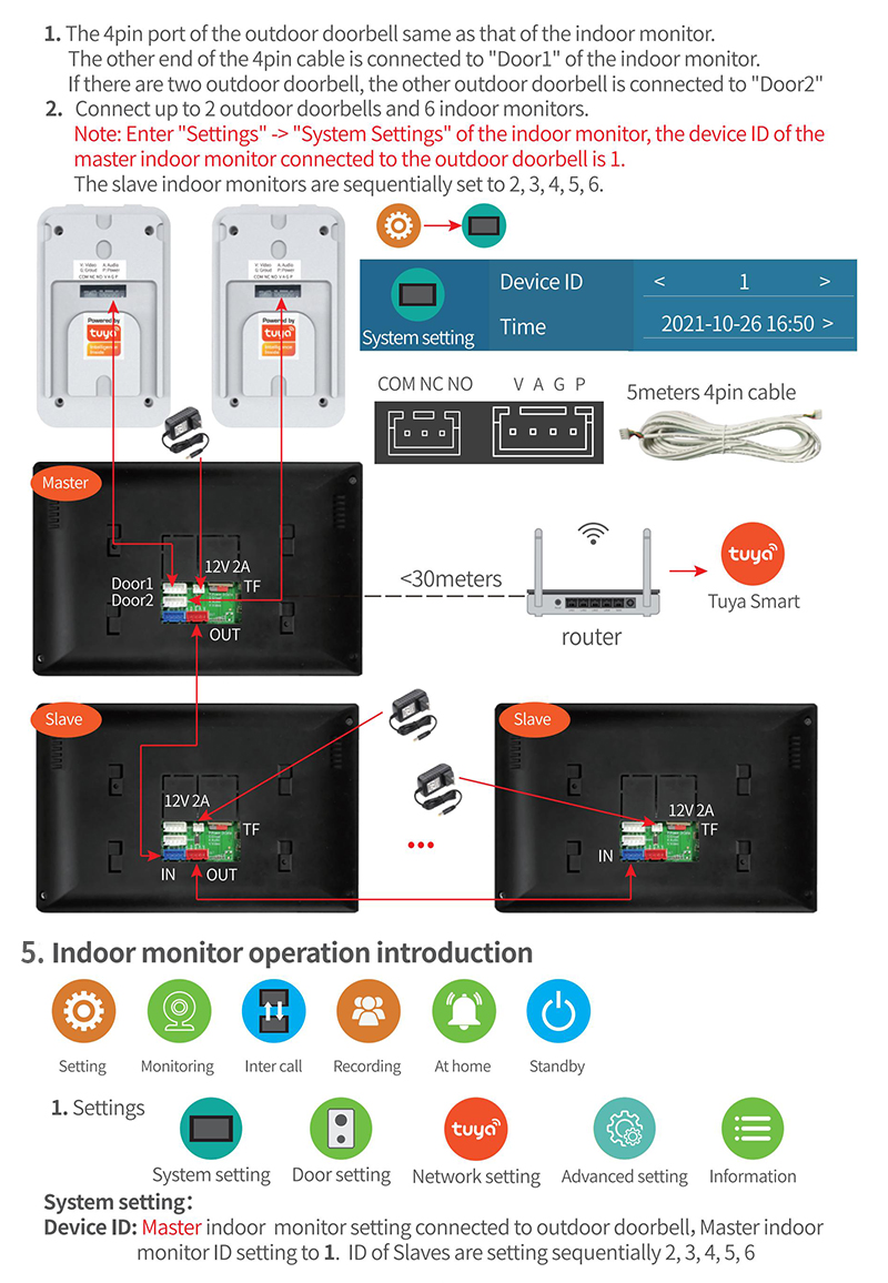 2. Подключение: можно подключить до 2 наружных дверных звонков и 6 внутренних мониторов, внутренние мониторы могут разговаривать друг с другом