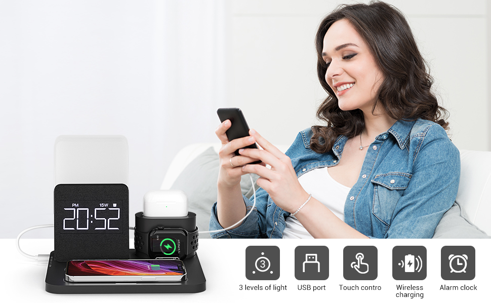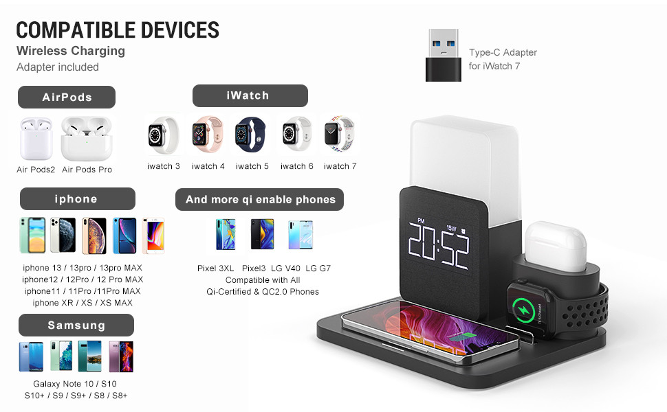 Беспроводная зарядная станция 3-в-1: беспроводное зарядное устройство использует новейшую беспроводную технологию Qi, оснащенную