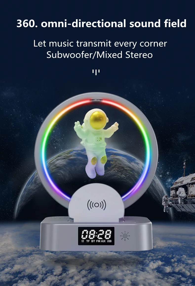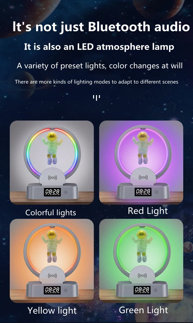 【Умный свет звуковой машины 7 в 1 】 Этот умный ночник для сна сочетает в себе светодиодную прикроватную лампу, динамик Bluetooth, беспроводную зарядку, будильник, TF-карту, USB-диск, подставку для телефона и украшение космонавта с магнитной левитацией. Он широко используется для бессонницы, медитации, спа, ванны, вечеринки, праздника, украшения дома, прикроватной лампы, лампы для тумбочки и т. Д.