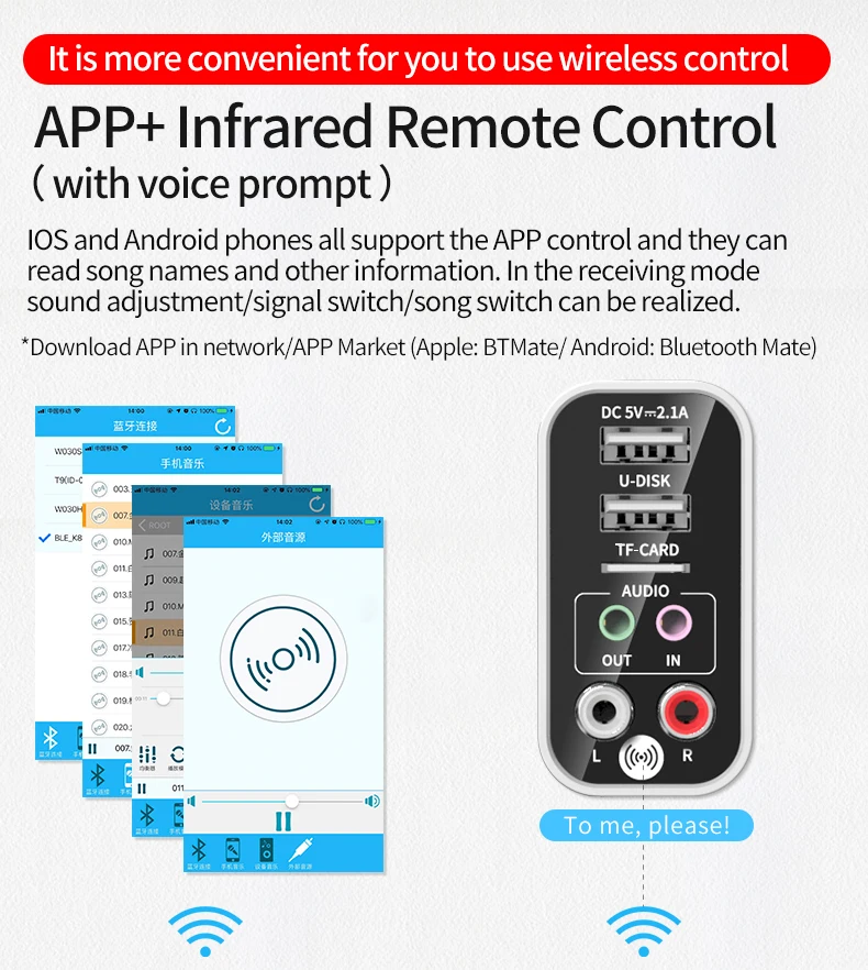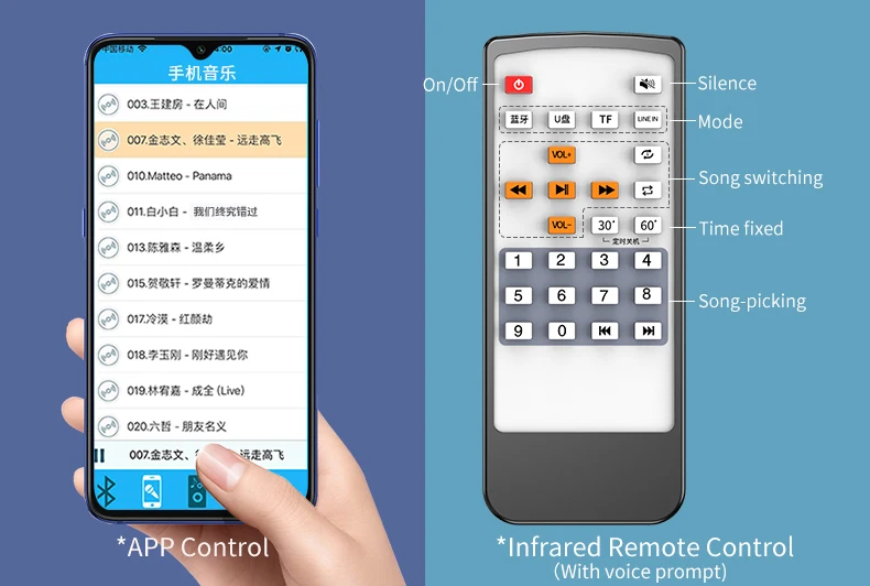 5. Support infrared remote control, switch on/off/mute/play/pause/up and down song/volume up/down/switching of sound source;