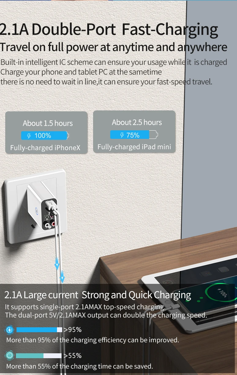 7. Built-in QC2.0 fast charging module, supporting 2.1A dual USB fast charging, easy charging for mobile phones, tablets, etc.;