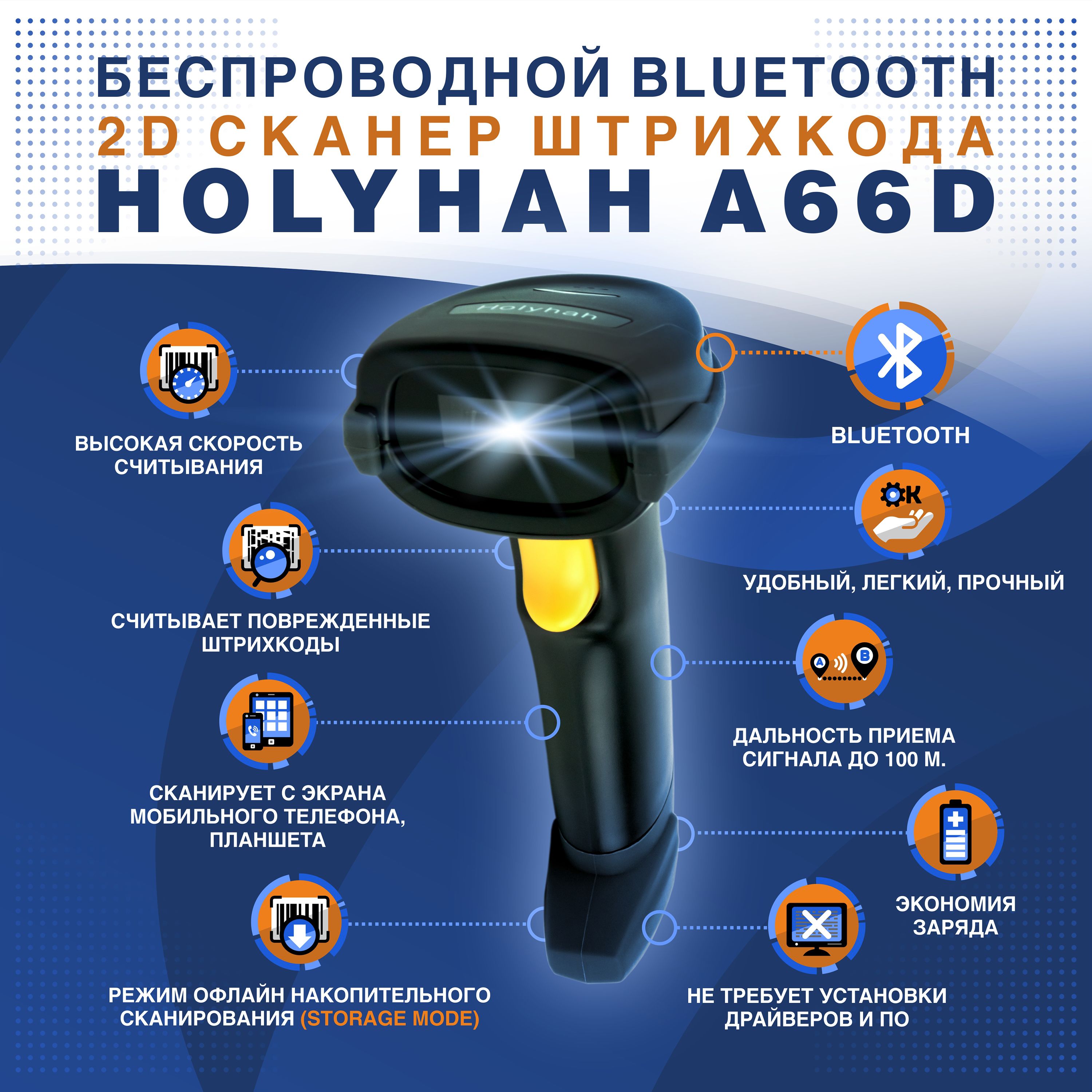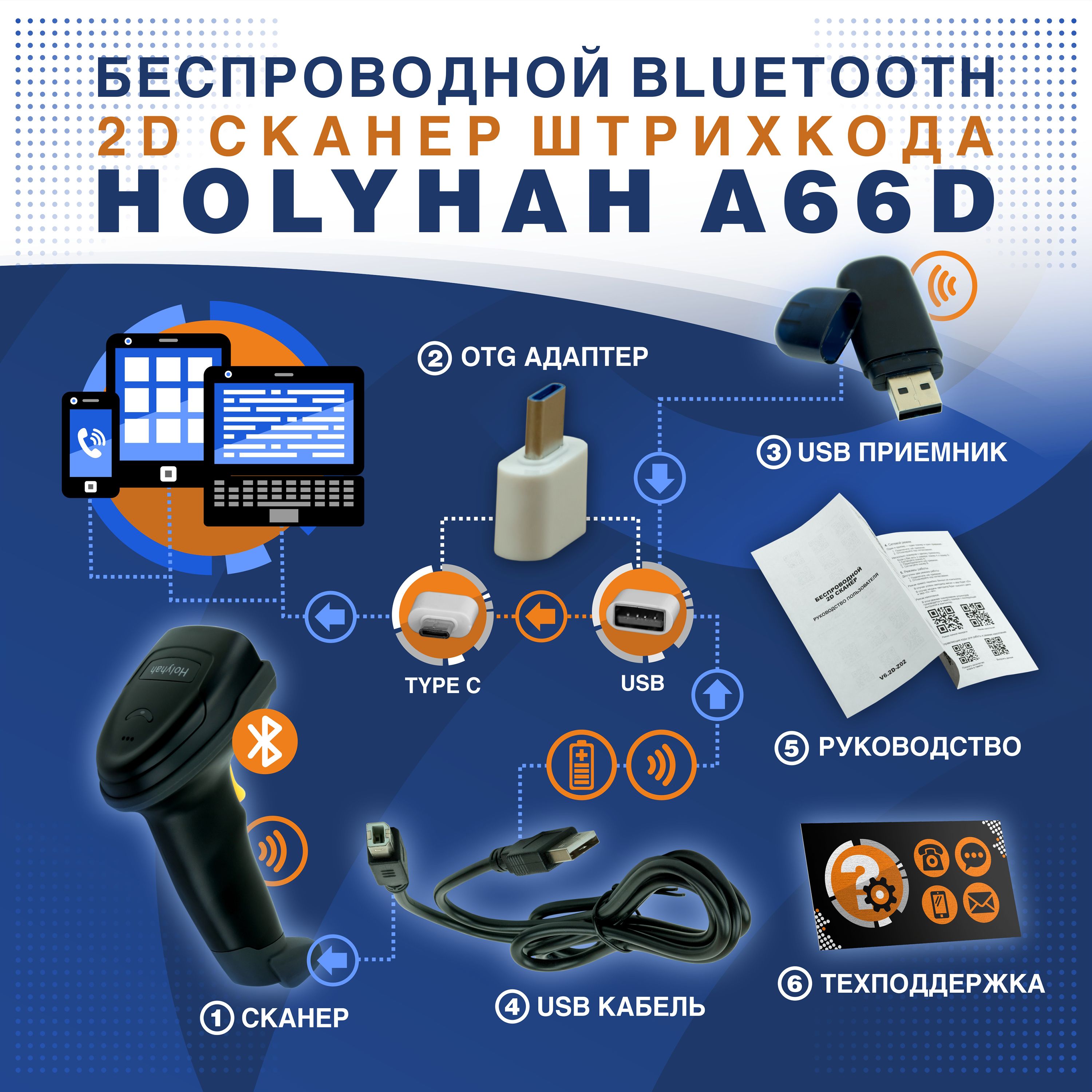 Беспроводной Bluetooth 2D сканер штрихкода Holyhah A66D USB для маркировки, ПВЗ, Честный знак, QR, Эвотор, Атол, Меркурий, 1D (русская инструкция)
