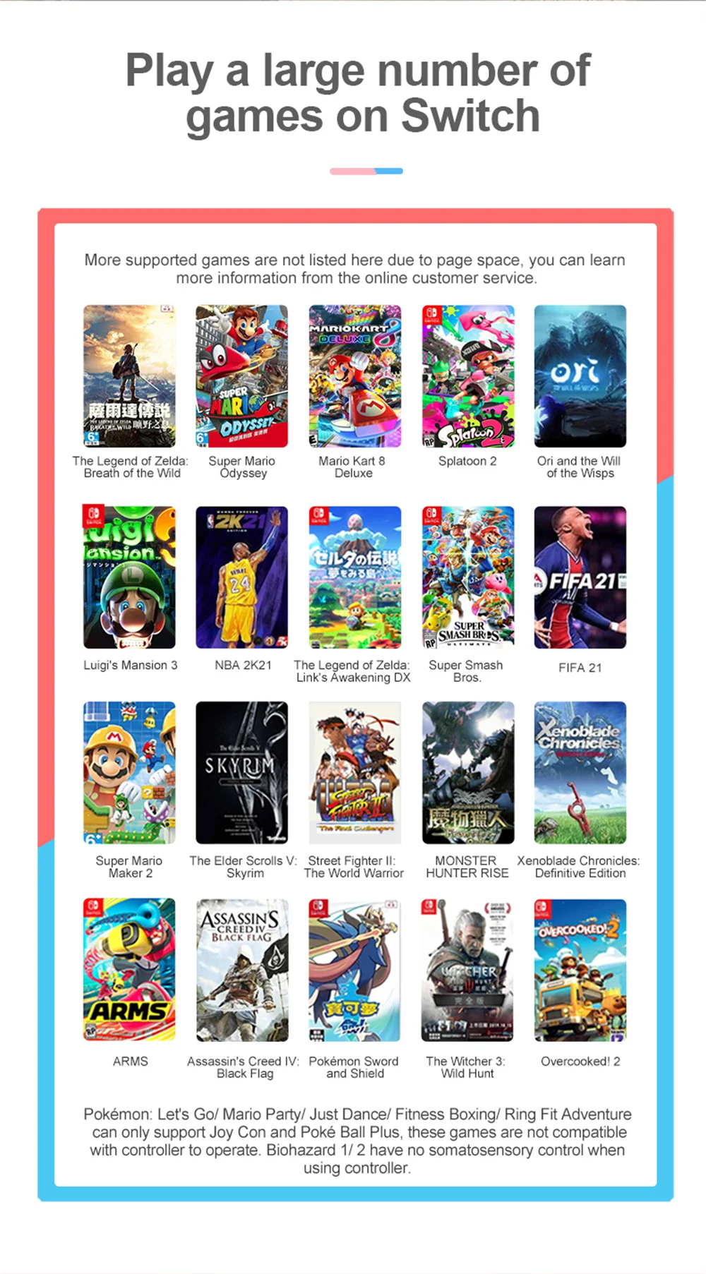 Поддержка использования в играх, доступных для контроллера на коммутаторе. (Не поддерживает Android, iOS,Mac и другие интеллектуальные устройства.)