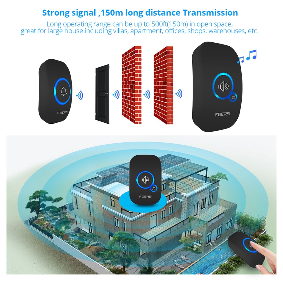 Беспроводной дверной звонок Fuers, домашний приветственный звонок, будильник, 32 мелодии, переключатель, водонепроницаемая кнопка, магазин в вилле, вход в отель, умный дверной звонок со светодиодной подсветкой