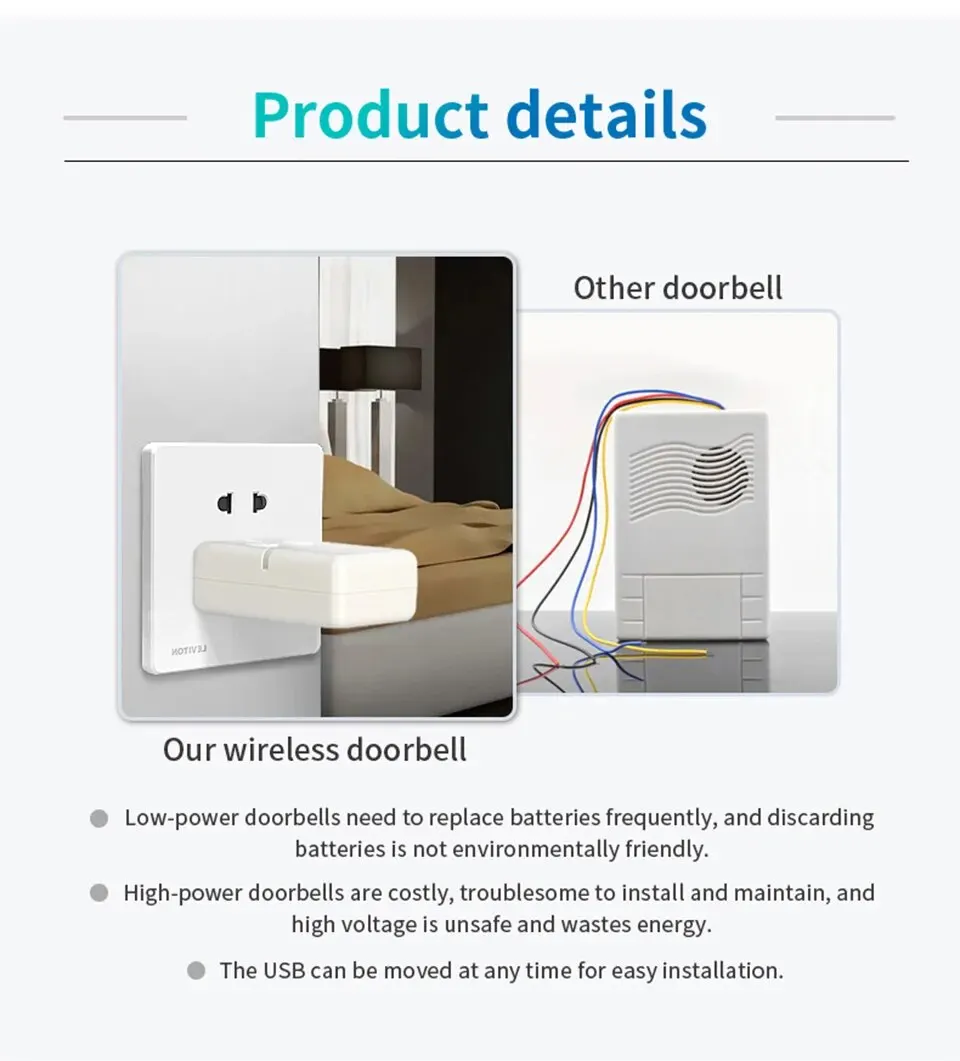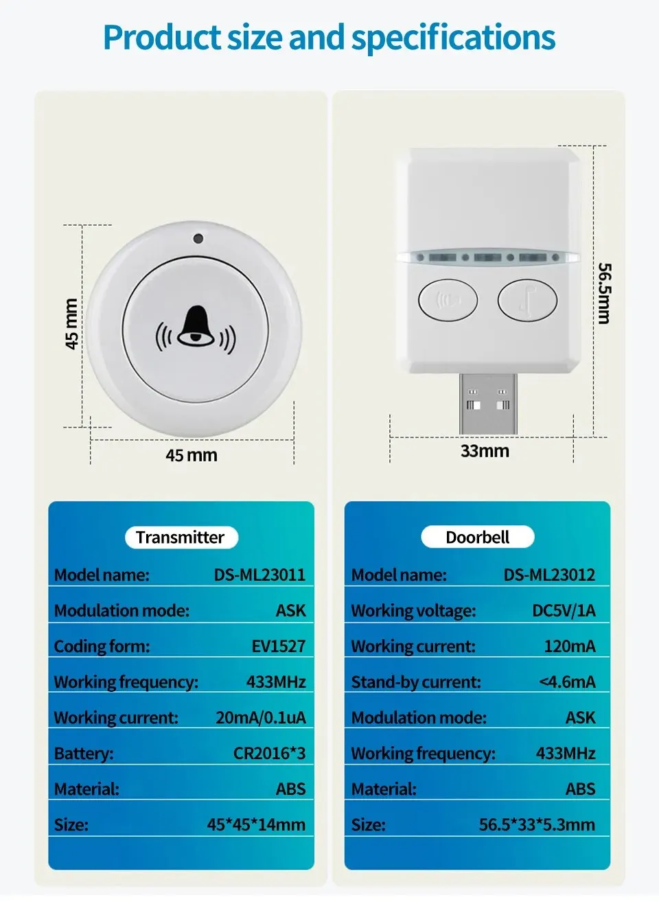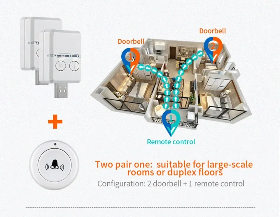 1 * передатчик (пульт дистанционного управления), 1 * приемник (дверной звонок), 1 * Руководство пользователя