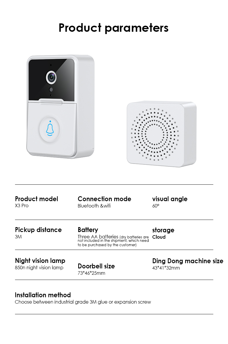 1 * Камера дверного звонка, 1 * машина Ding Dong для помещений, 1 * клейкая наклейка, 4 * винт, 1 * Руководство пользователя