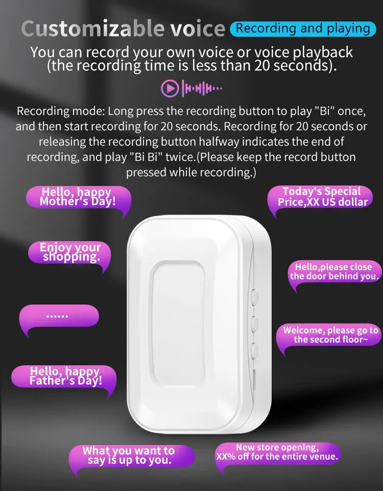 Нажмите и удерживайте кнопку записи, чтобы воспроизвести «Bi» один раз, а затем Начните запись в течение 20 секунд. Запись в течение 20 секунд или отпускание кнопки записи на полпути указывает на окончание записи и воспроизведение «Bi» дважды. (Пожалуйста, удерживайте кнопку записи нажатой во время записи.)