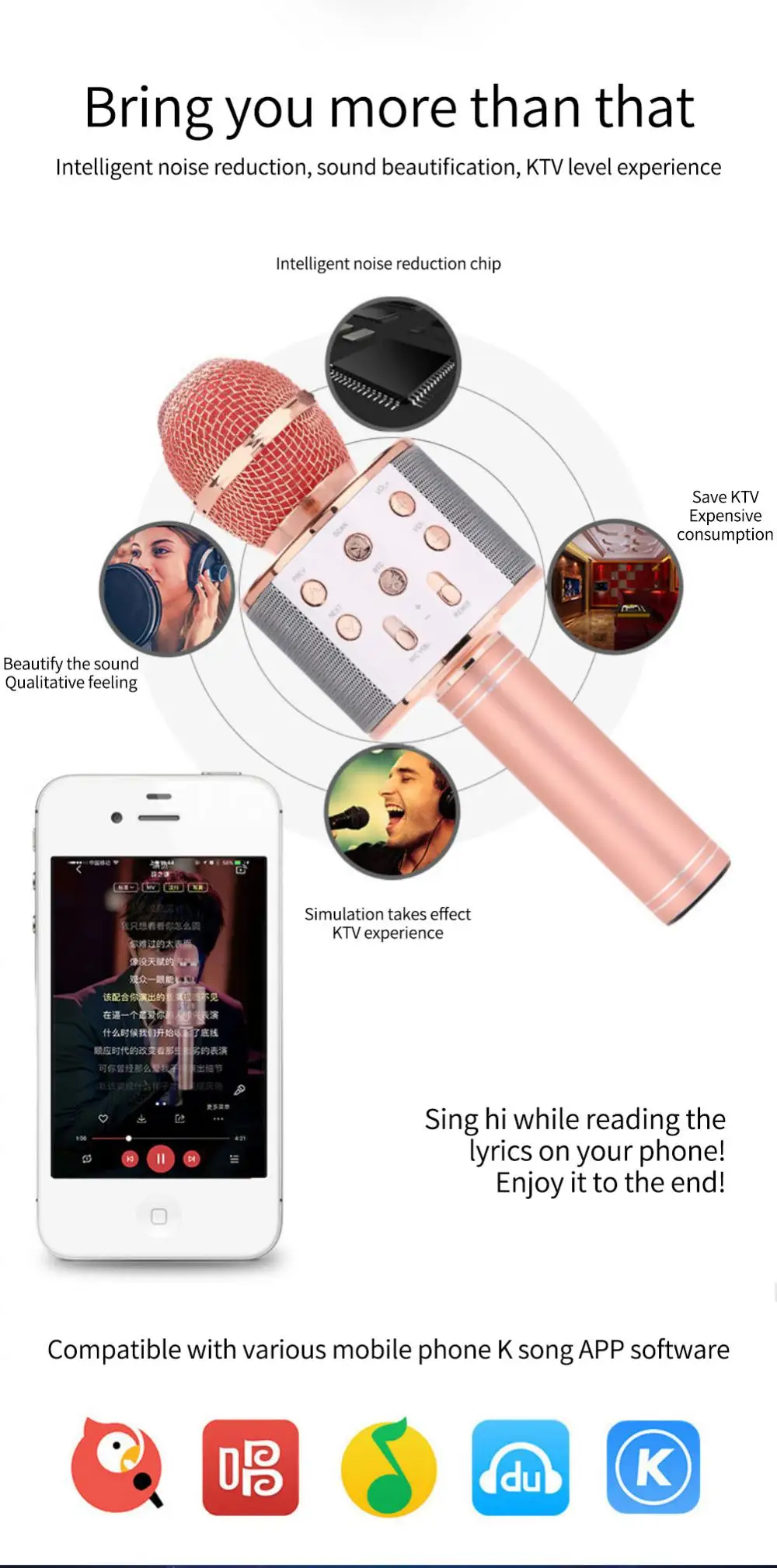 ПРОСТОТА ИСПОЛЬЗОВАНИЯ И ПОРТАТИВНЫЙ МИКРОФОН-Создайте многофункциональную кнопку, вы можете регулировать басы, высокие частоты, эхо, громкость воспроизведения и т. Д. И свободно переключаться между предыдущей и следующей песней. Поскольку Он легкий и удобный для переноски, его удобно носить с собой в разных местах. Эффективная имитация уровня KTV.