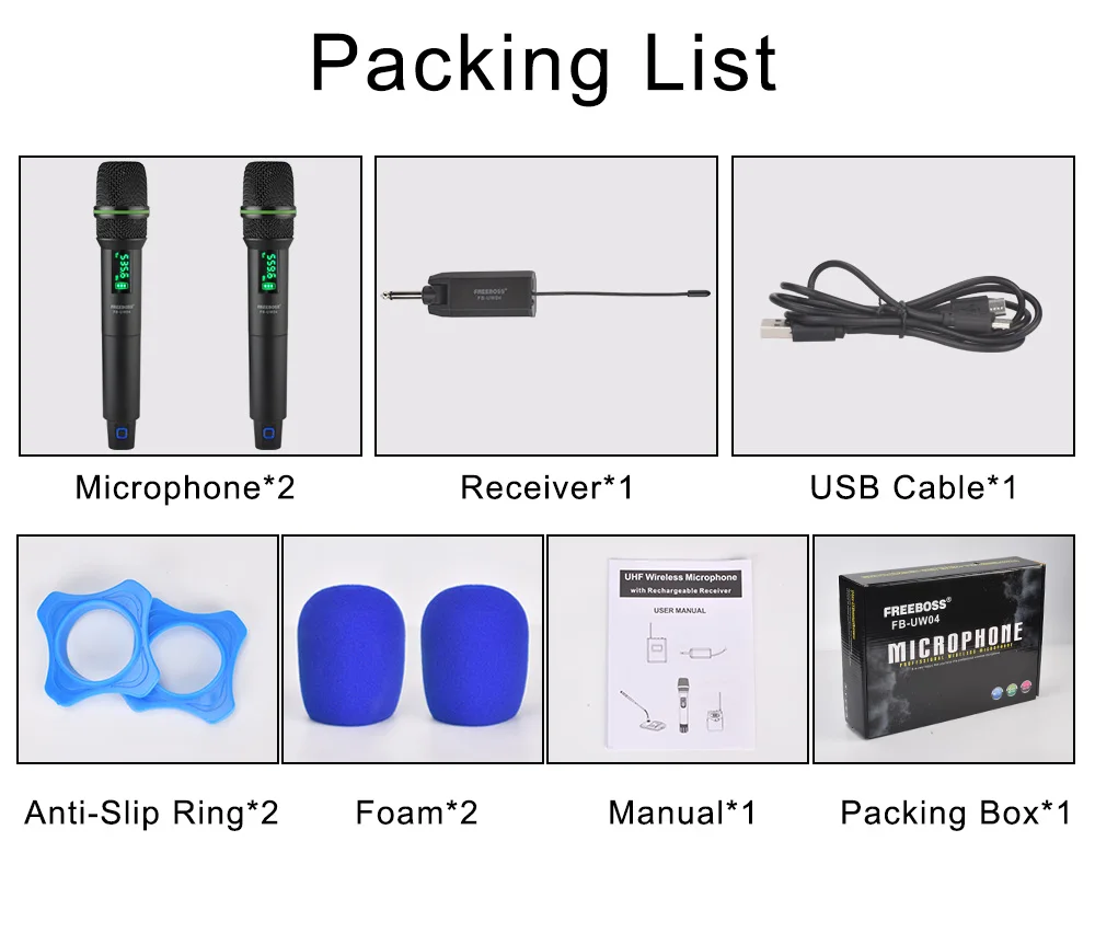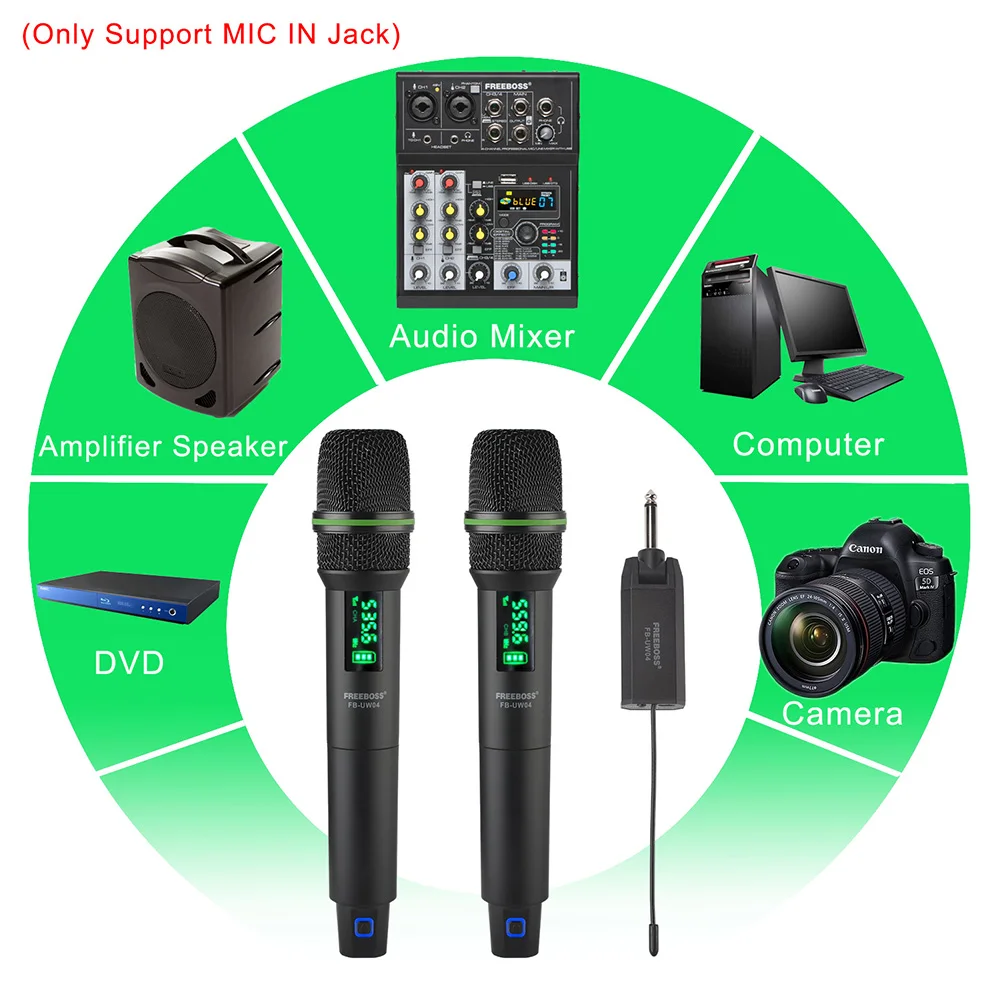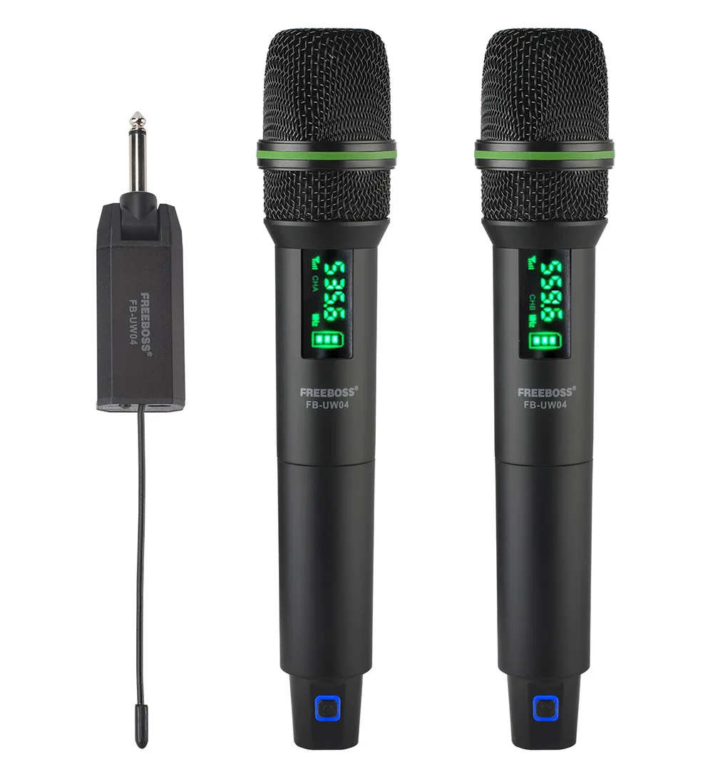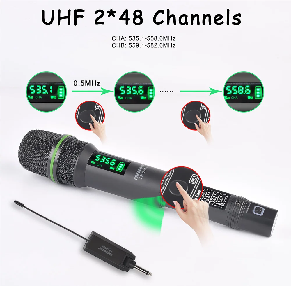 FB-UW04 беспроводной микрофон принимает UHF Частотный диапазон передает сигнал, конструкция 2 каналов для приема сигнала, регулируемый 48 частотный канал. Если вы используете несколько микрофонов одновременно или шум, нажмите переключатель частоты для регулировки частоты. И расстояние передачи беспроводного микрофона до 72 футов/22 м.
