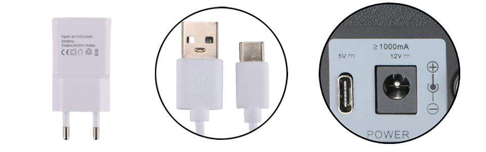 В упаковке есть цельный адаптер питания 5V1A и кабель питания.