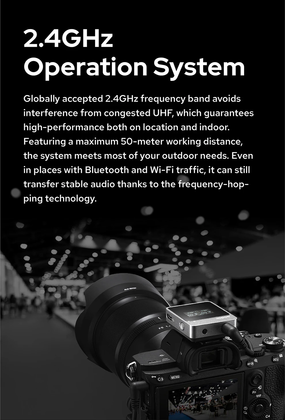 1. Операционная СИСТЕМА 2,4 ГГц: принятый во всем мире Диапазон частот 2,4 ГГц позволяет избежать помех от перегруженности УВЧ, что гарантирует высокую производительность как на месте, так и в помещении. Благодаря максимальному рабочему расстоянию 50 метров система удовлетворяет большинство ваших потребностей на открытом воздухе.