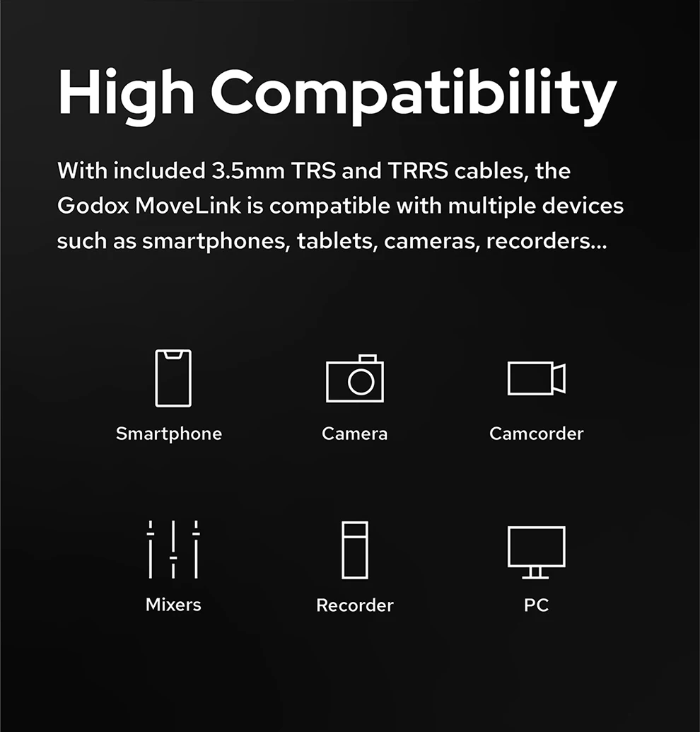 5. Высокая Совместимость: с прилагаемыми кабелями TRS и TRRS 3,5 мм Godox MoveLink совместим с несколькими устройствами, такими как смартфоны, планшеты, камеры, рекордеры и т. Д.;