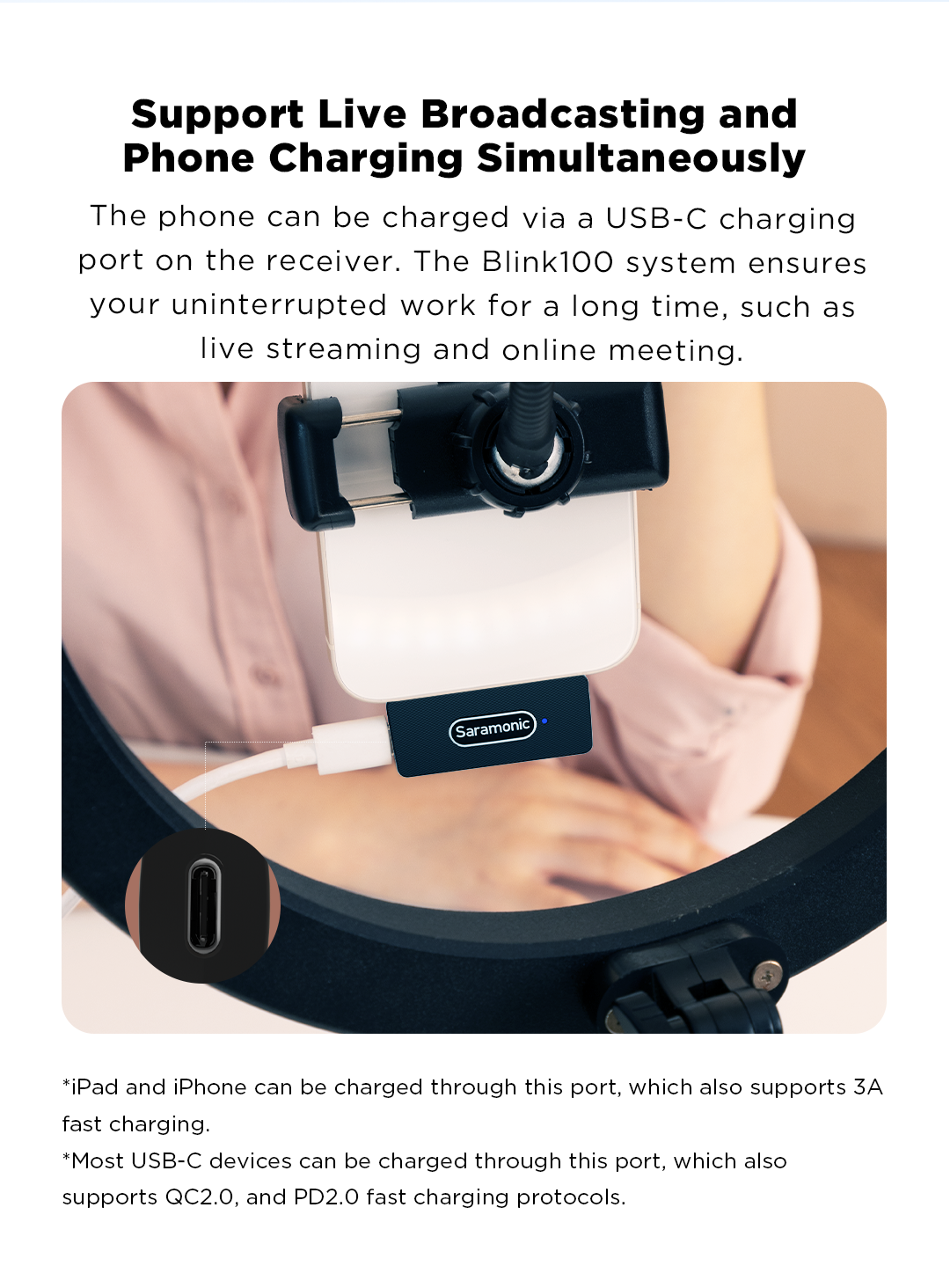 🎙️ Blink100 B3/B4 Приемник Blink100 RXDi подключается непосредственно к устройствам iOS, таким как iPhone, iPad и многим другим. Телефон можно заряжать через порт зарядки USB-C на приемнике во время использования.