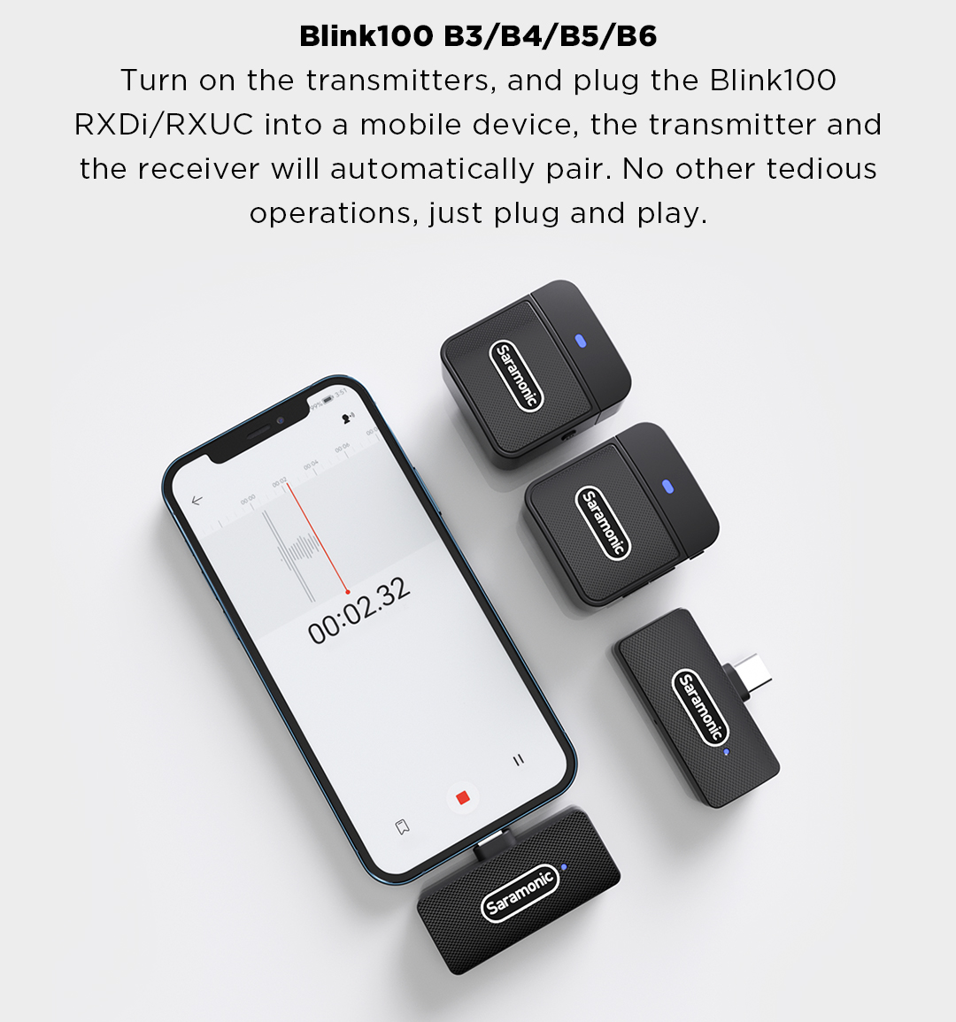🎙️ Blink100 B5/B6 Включите передатчики и подключите Blink100 RXUC к мобильному устройству, передатчик и приемник будут автоматически сопряжены. Никаких других утомительных операций, просто подключи и работай. Приемник Blink100 RXUC не требует батарей или зарядки для работы. Приемник Blink100 RXUC подключается непосредственно к мобильным устройствам с портами USB-C, таким как смартфоны или планшеты Android, компьютеры и многое другое. Телефон можно заряжать через порт зарядки USB-C на приемнике во время использования.