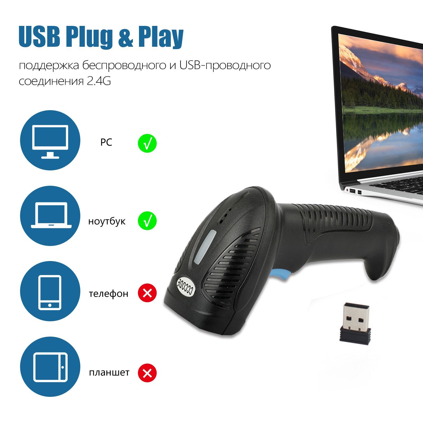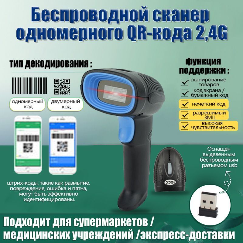 2.Беспроводная связь и USB: Для обеспечения наилучшего качества сканирования мы впервые объединили 3 используемых подключения. Совместим с приемником беспроводной связи 2.4G; Проводное usb-соединение. Легко подключается к вашему ноутбуку, ПК, мобильному телефону, планшету, iphone, POS. Работа с Windows XP/7/8/10 , Mac OS, Windows Mobile, Android OS, iOS.