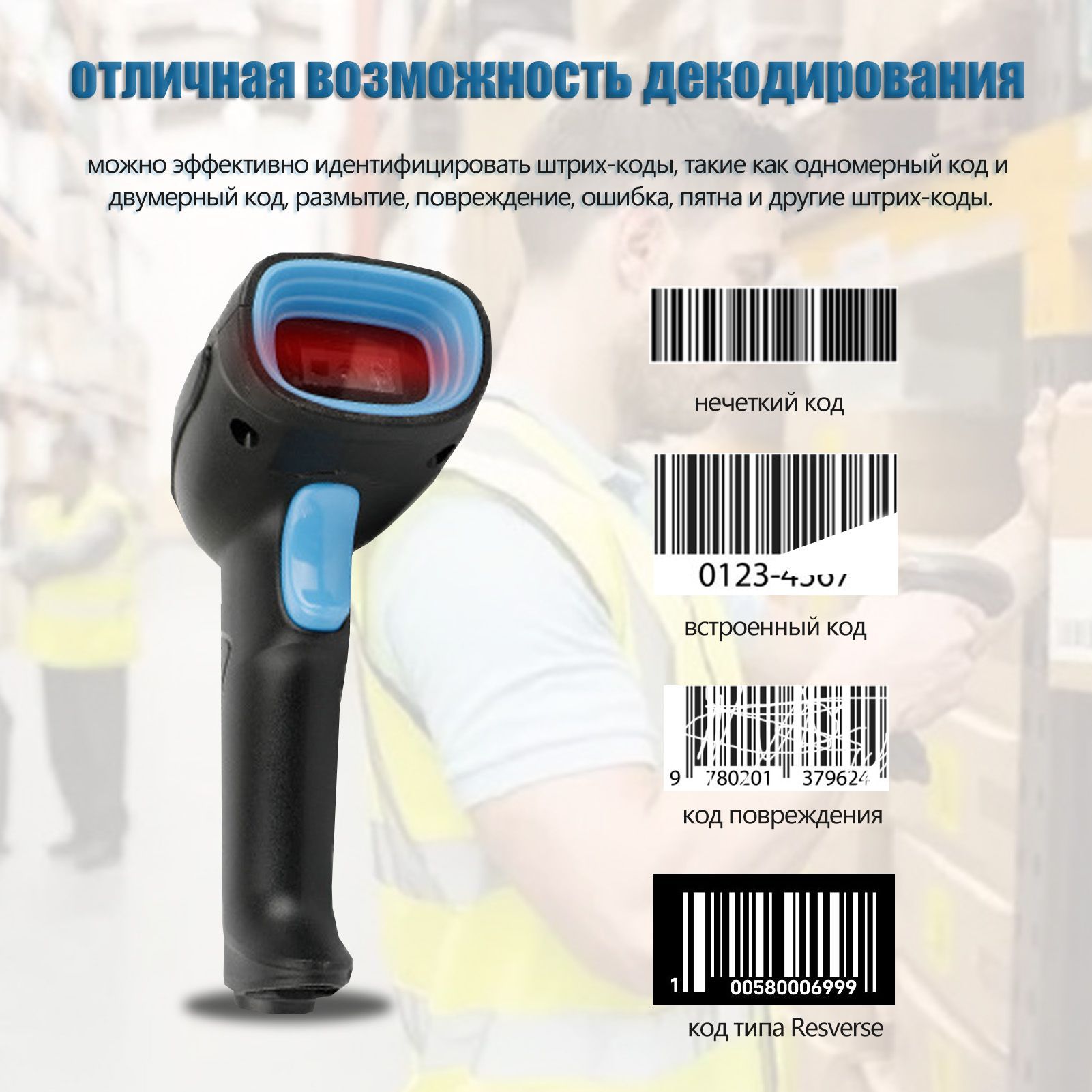 4.Режим автоматического сканирования и хранения: Режим автоматического сканирования можно настроить в соответствии с вашими потребностями. Автоматическое сканирование сенсора без нажатия кнопки. Когда расстояние подключения сканера превысит допустимое, вы можете выбрать режим хранения. В режиме хранения можно сохранить и загрузить непосредственно до 100 000 штрих-кодов, когда вы вернетесь на расстояние подключения.