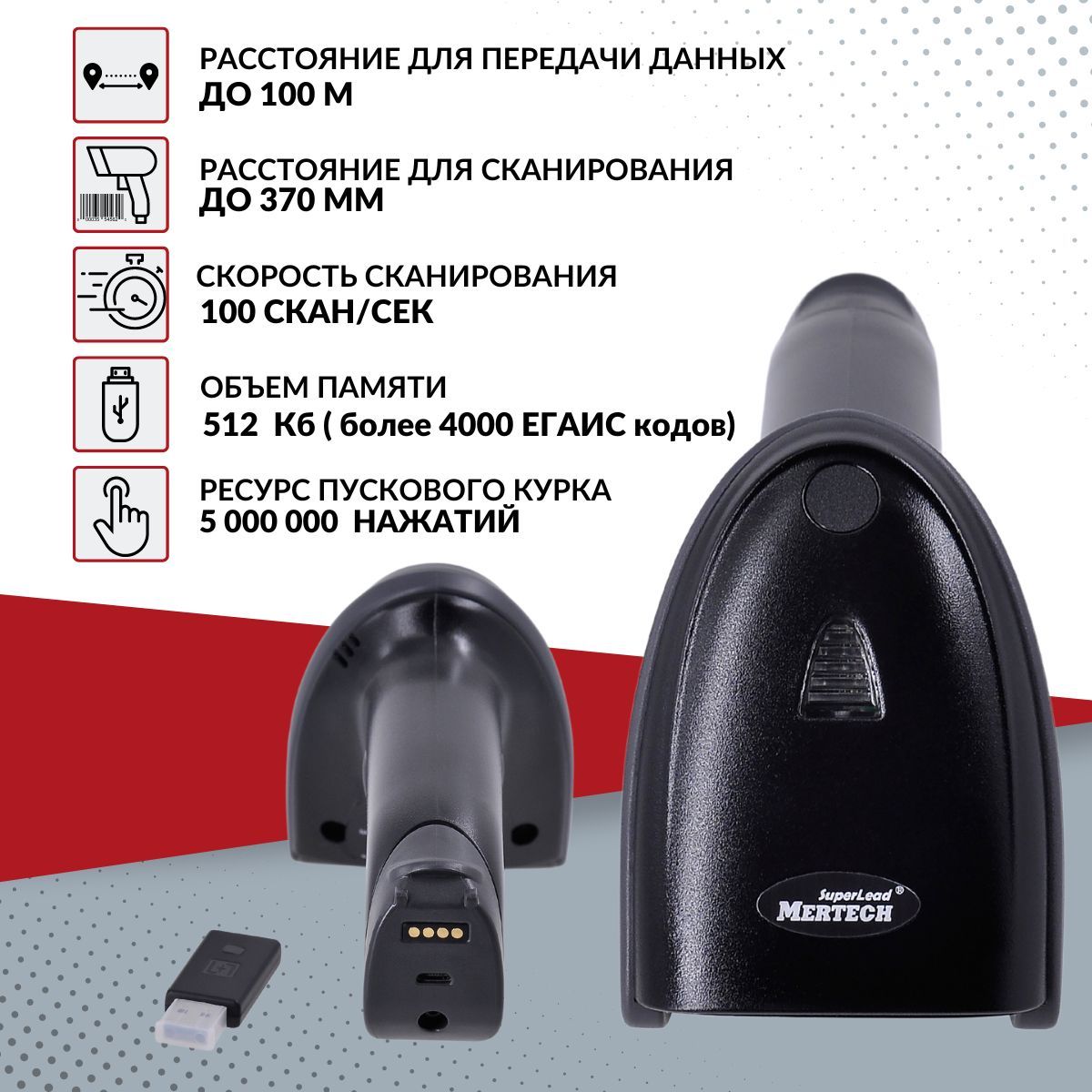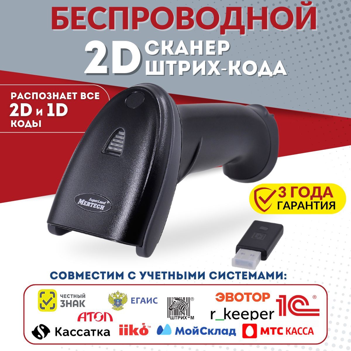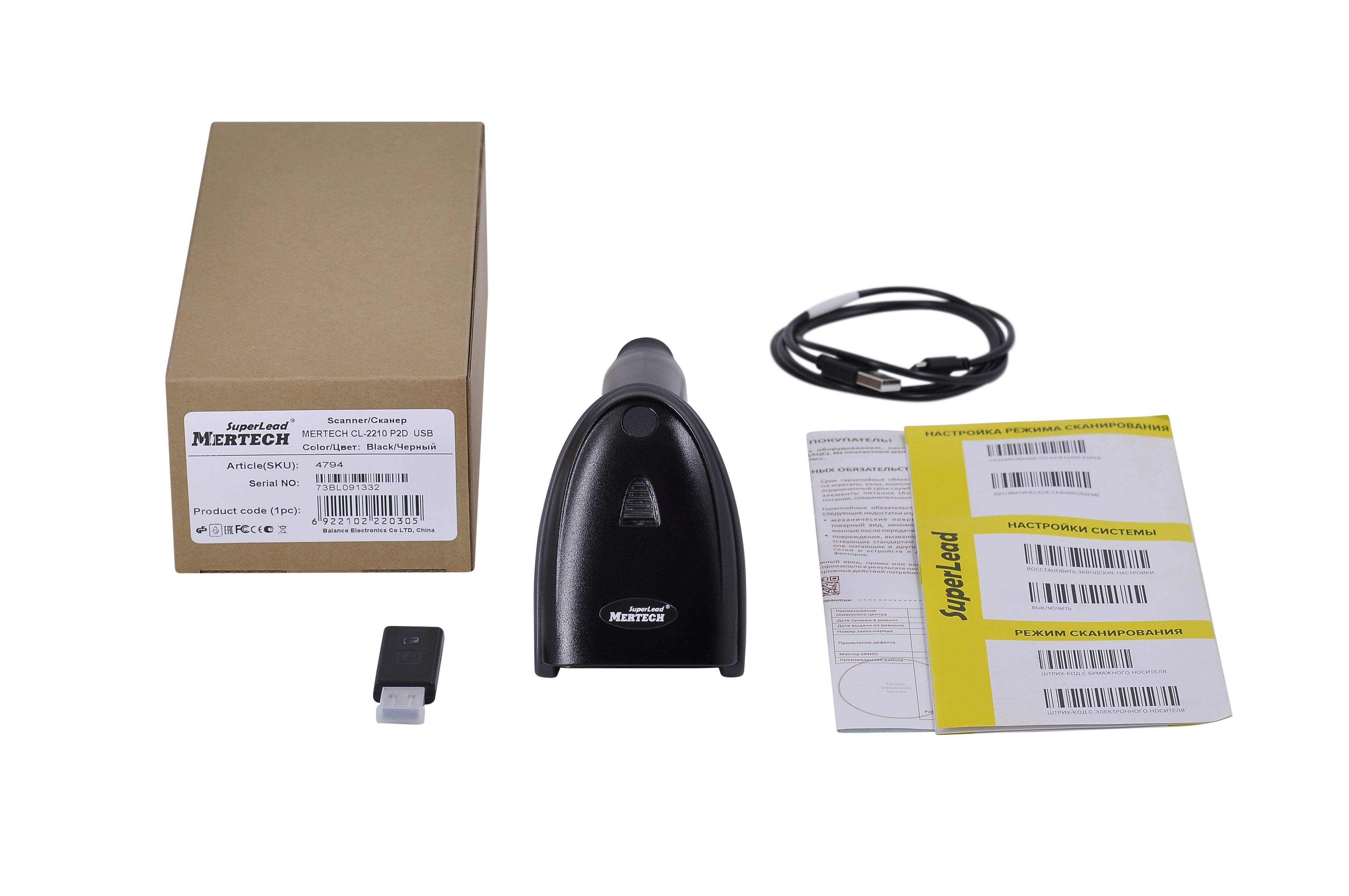 Беспроводной сканер Mertech CL-2210, кабель USB 1шт, USB приемник, гарантийный талон , инструкция