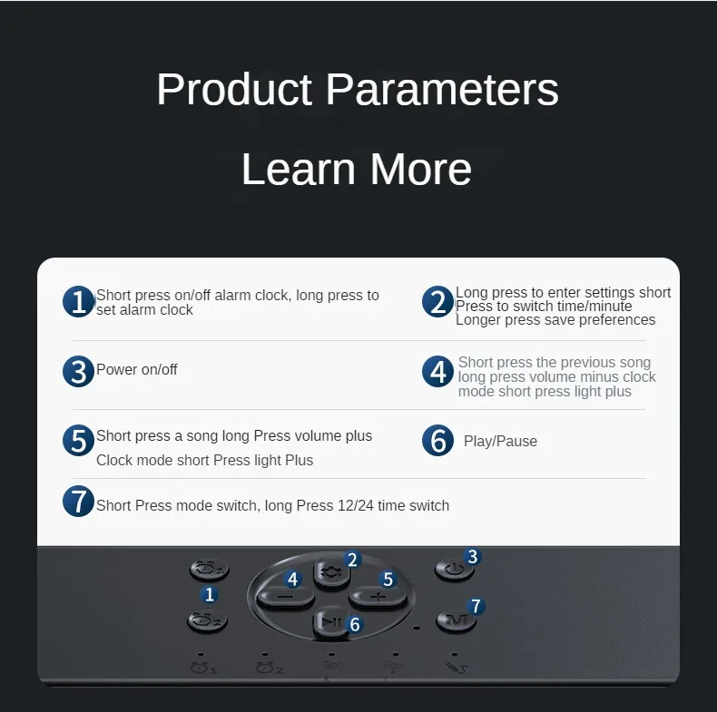 Короткое нажатие предыдущей песни, длительное нажатие громкости для уменьшения, короткое нажатие света для увеличения в режиме часов