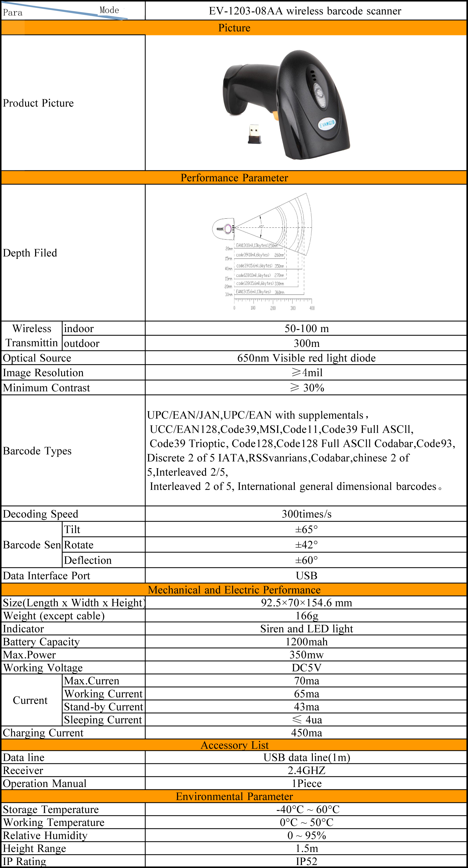 Беспроводной сканер штрих-кодов EVAWGIB, 1D CCD, 2,4 ГГц