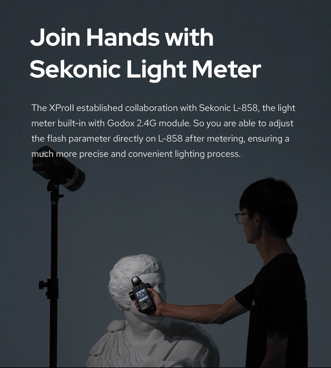 XProll наладил сотрудничество с Sekonic L-858, светомером, встроенным в модуль Godox 2,4G. Таким образом, вы можете настроить параметр вспышки непосредственно на L-858 после замера, обеспечивая более точный и удобный процесс освещения.