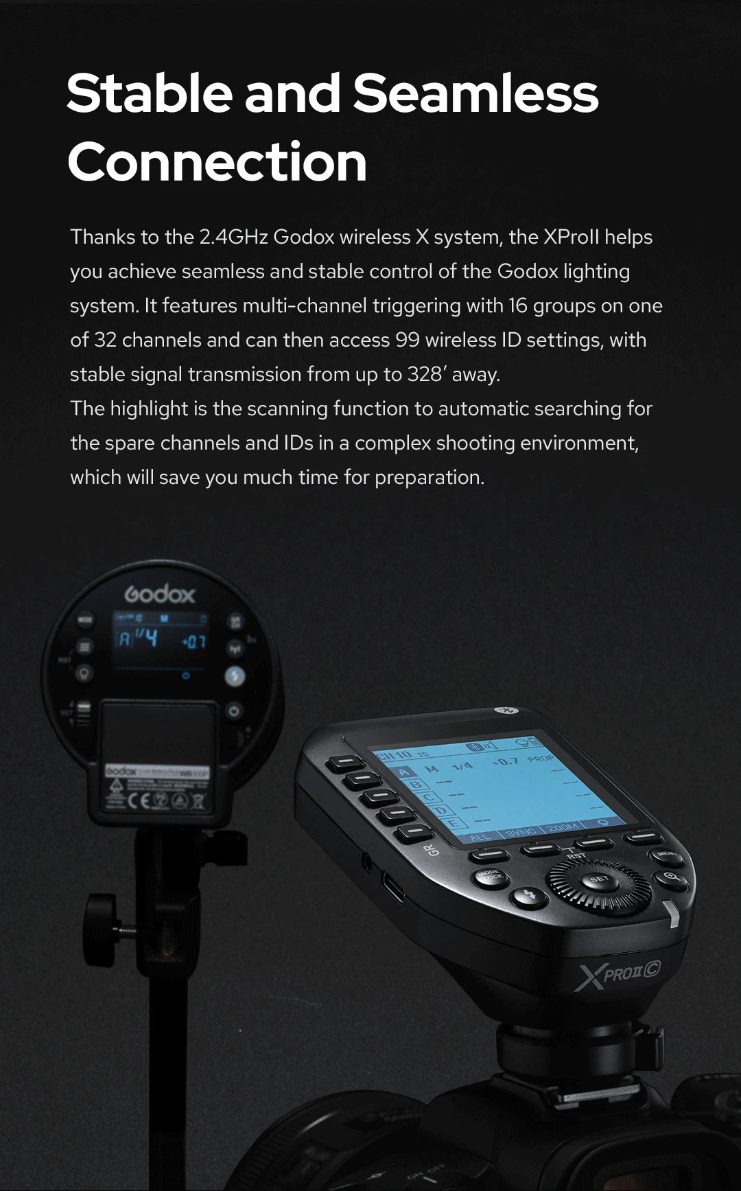 Благодаря беспроводной × системе Godox 2,4 ГГц XProll помогает вам добиться плавного и стабильного управления системой освещения Godox. Ilt отличает многоканальным вызывать с 16 группами на одном из 32 каналов и может после этого получать доступ к 99 беспроводным установкам ИД, с стабилизированной передачей сигнала от до 328 'прочь.