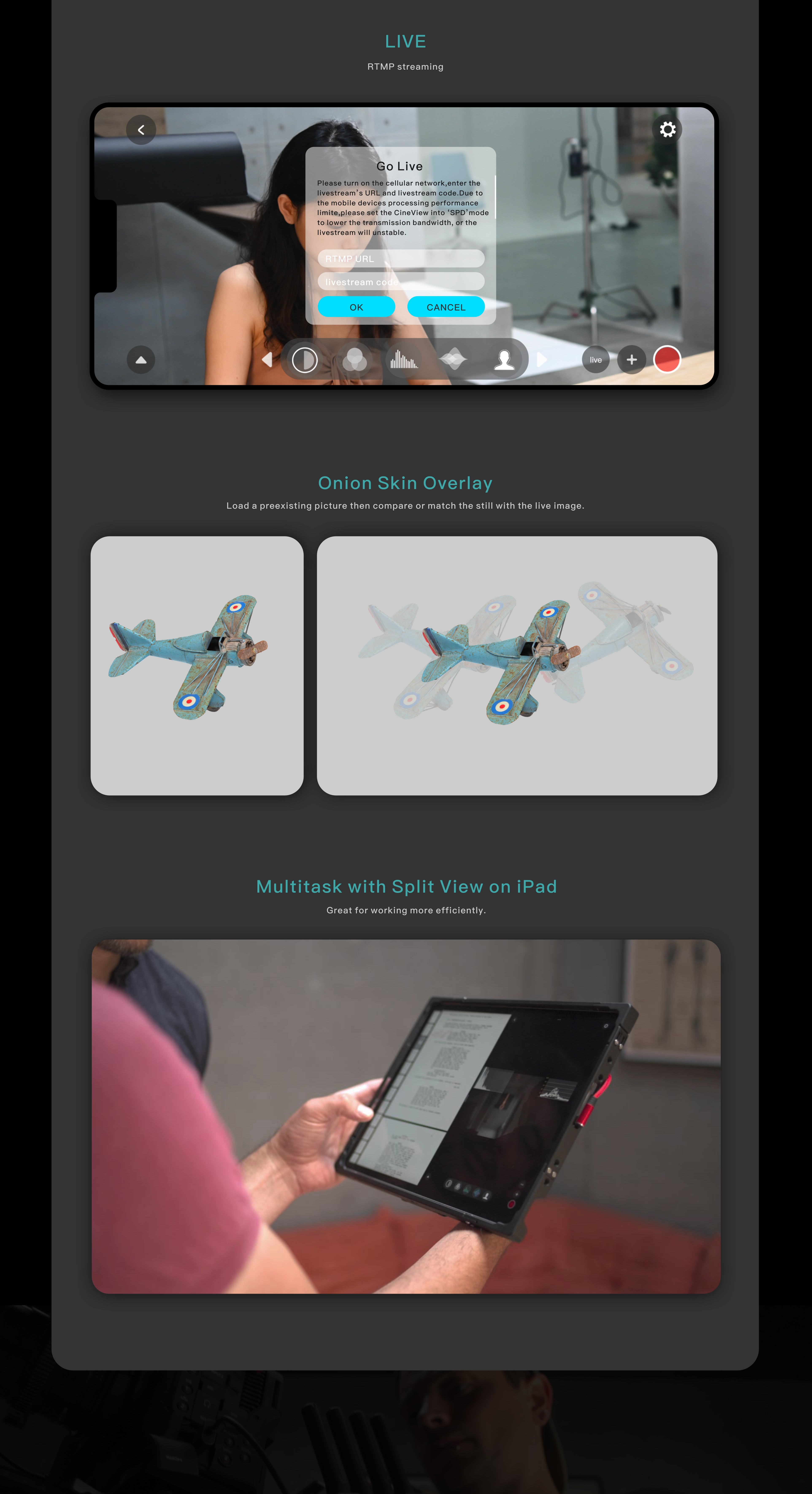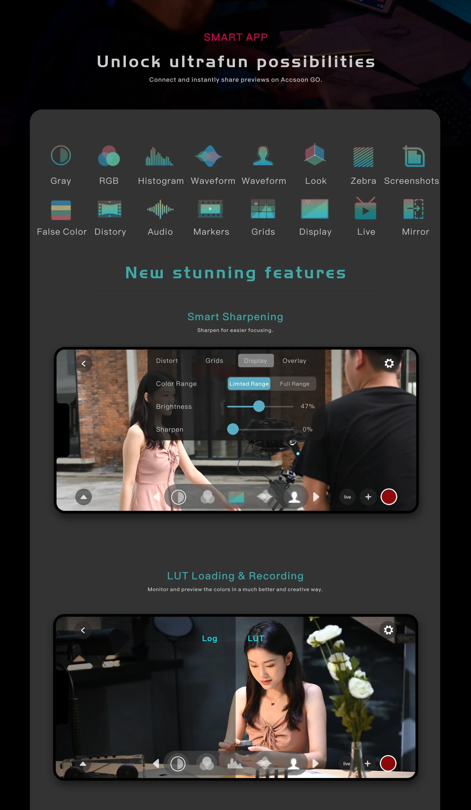 Приложение Accsoon Go открывает больше, чем просто канал-оно позволяет пользователям добавлять наложения LUT на изображение, проверять фокус с помощью пика, экспозицию с ложным цветом, или даже прямая трансляция прямо с вашего смартфона.