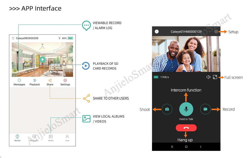 Подключив беспроводной маршрутизатор дома, вы можете осуществлять мониторинг между портативным концом (портативный конец включает смартфон, планшеты Android) и дверным звонком. Двусторонний домофон, Запись фотографий и т. Д.