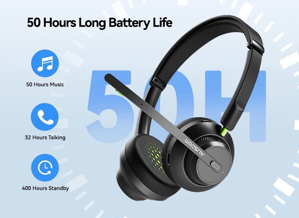 Эта беспроводная гарнитура обеспечивает 50 часов воспроизведения и 32 часа в режиме разговора.