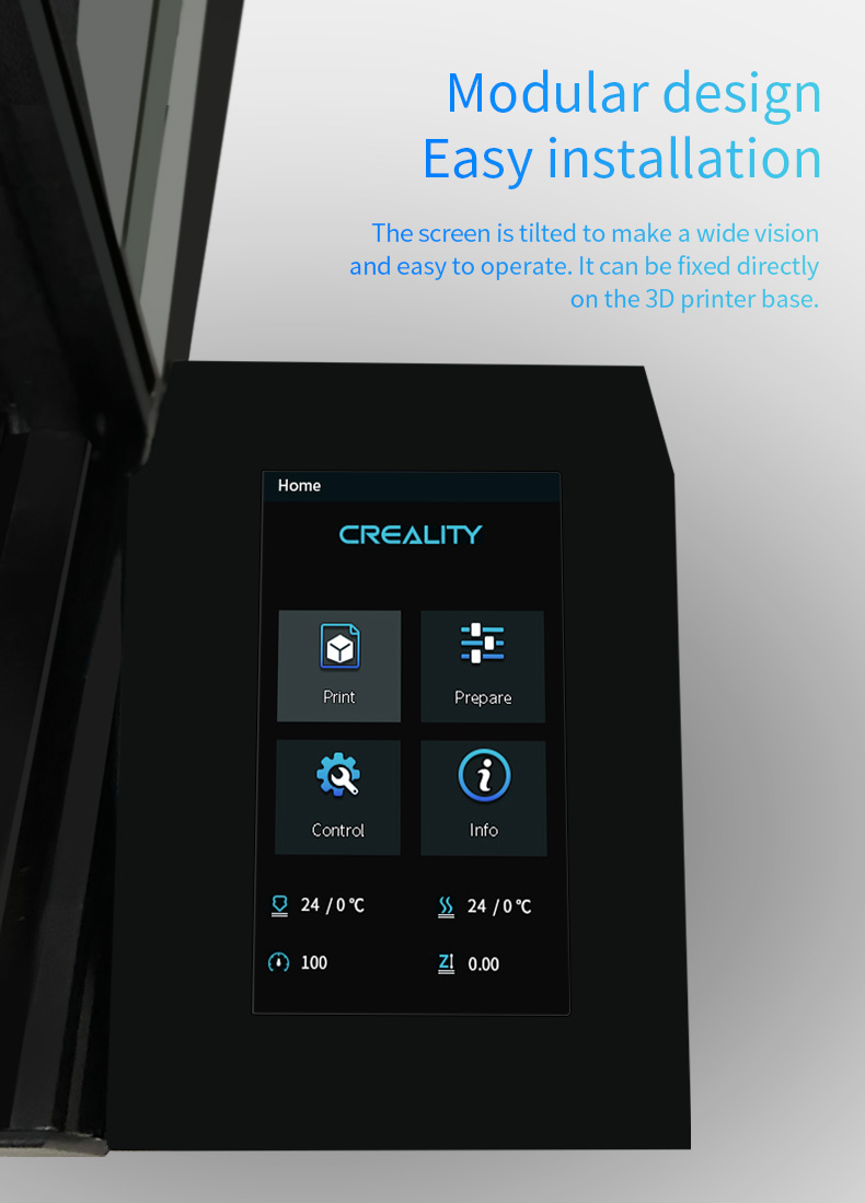 Экран наклонен для обеспечения широкого обзора и прост в эксплуатации. Его можно закрепить прямо на базе 3D-принтера.