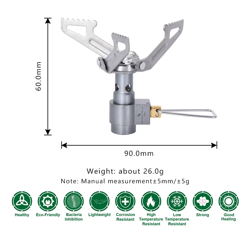 Бренд: безграничный Вояж Модель: Ti9009O Материал: титановый сплав, магниевый алюминиевый сплав, медный сплав Мощность: 2700 Вт Размер: лягушка 81.8x60.3 мм (использование), лягушка 37x52мм (складной) Вес: 0,8 унций (25 г) Топливо: бутановый газ Расход топлива: 4,9 OZ (140g) газа/час Время кипения воды 1Л: около 2'58" Вес подшипника: 2,7 кг Способ розжига: внешняя зажигалка