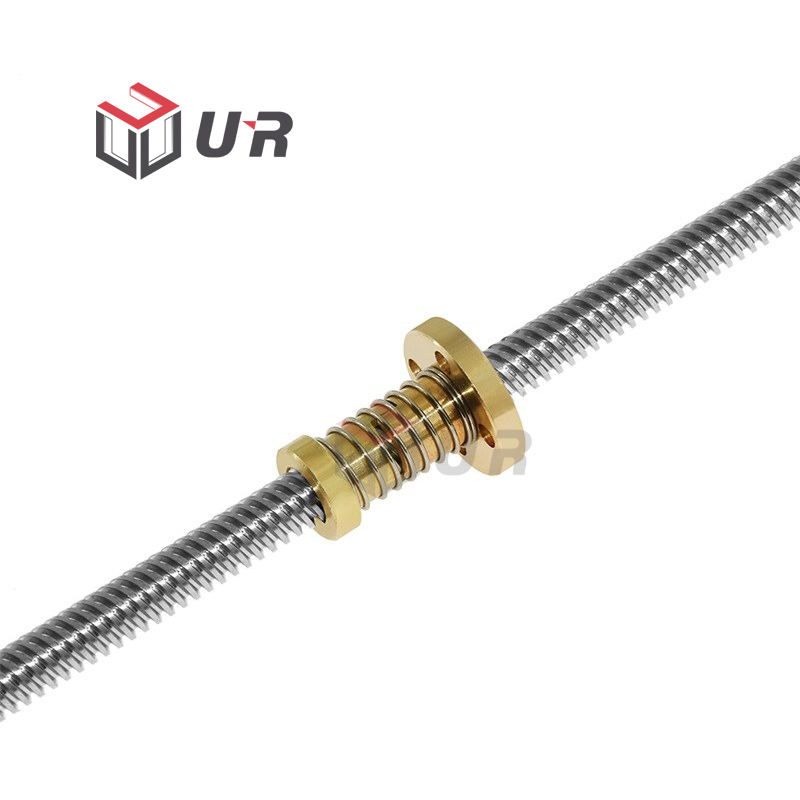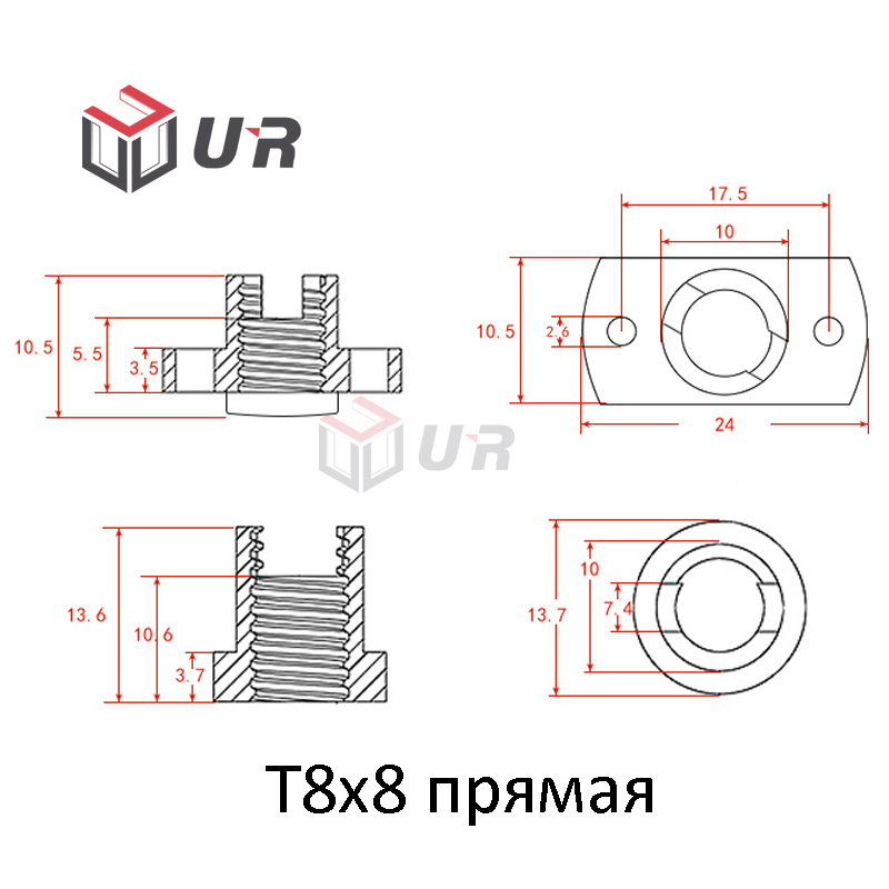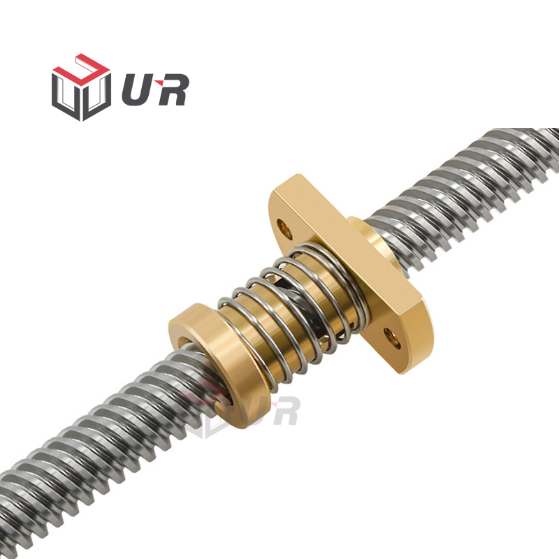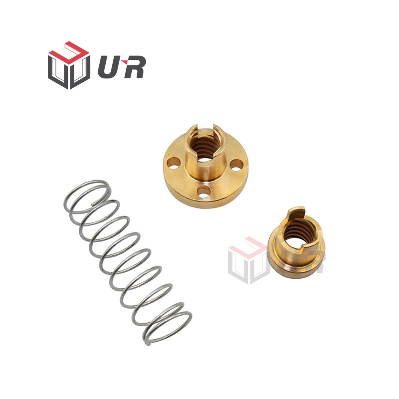 Безлюфтовая бронзовая гайка для трапецеидального винта диаметром 8 мм. Гайка состоит из двух частей, между которыми устанавливается пружина. Сила упругости пружины отталкивает части гайки друг от друга, что позволяет уменьшить люфт и снизить погрешность вращательно-поступательного движения.