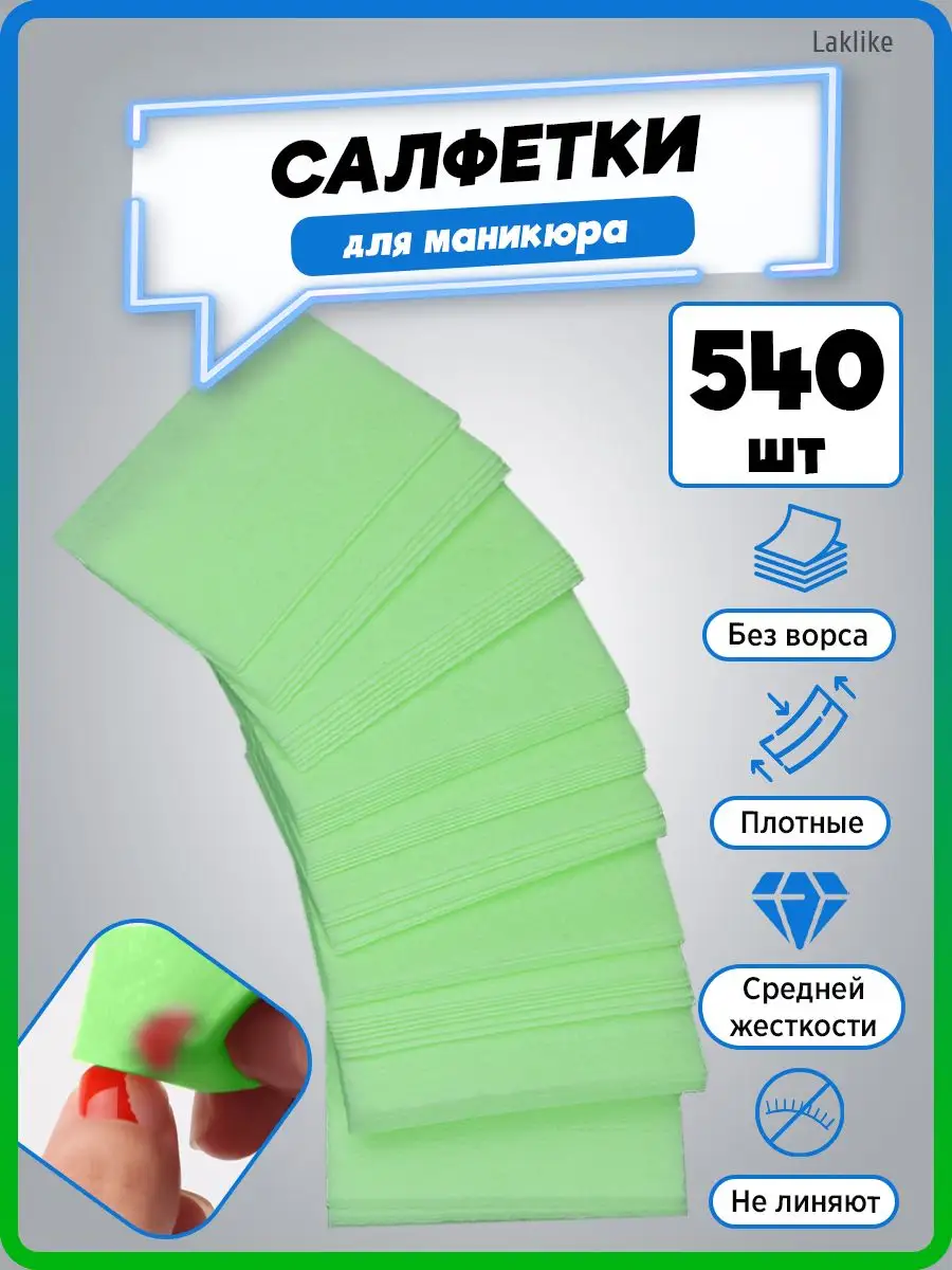 Комплектация салфетки 540 шт; Салфетки косметические; безворсовые салфетки для маникюра упаковка 540 шт; Безворсовые салфетки для снятия гель лака