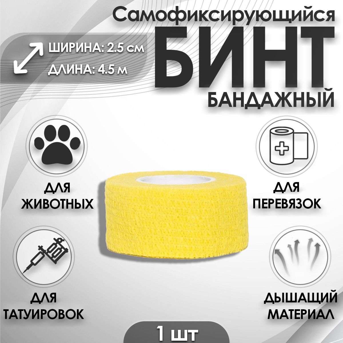 Бинт (бандаж) универсальный эластичный самофиксирующийся, для тату, животных и перевязок, 2,5см х 450см, Желтый