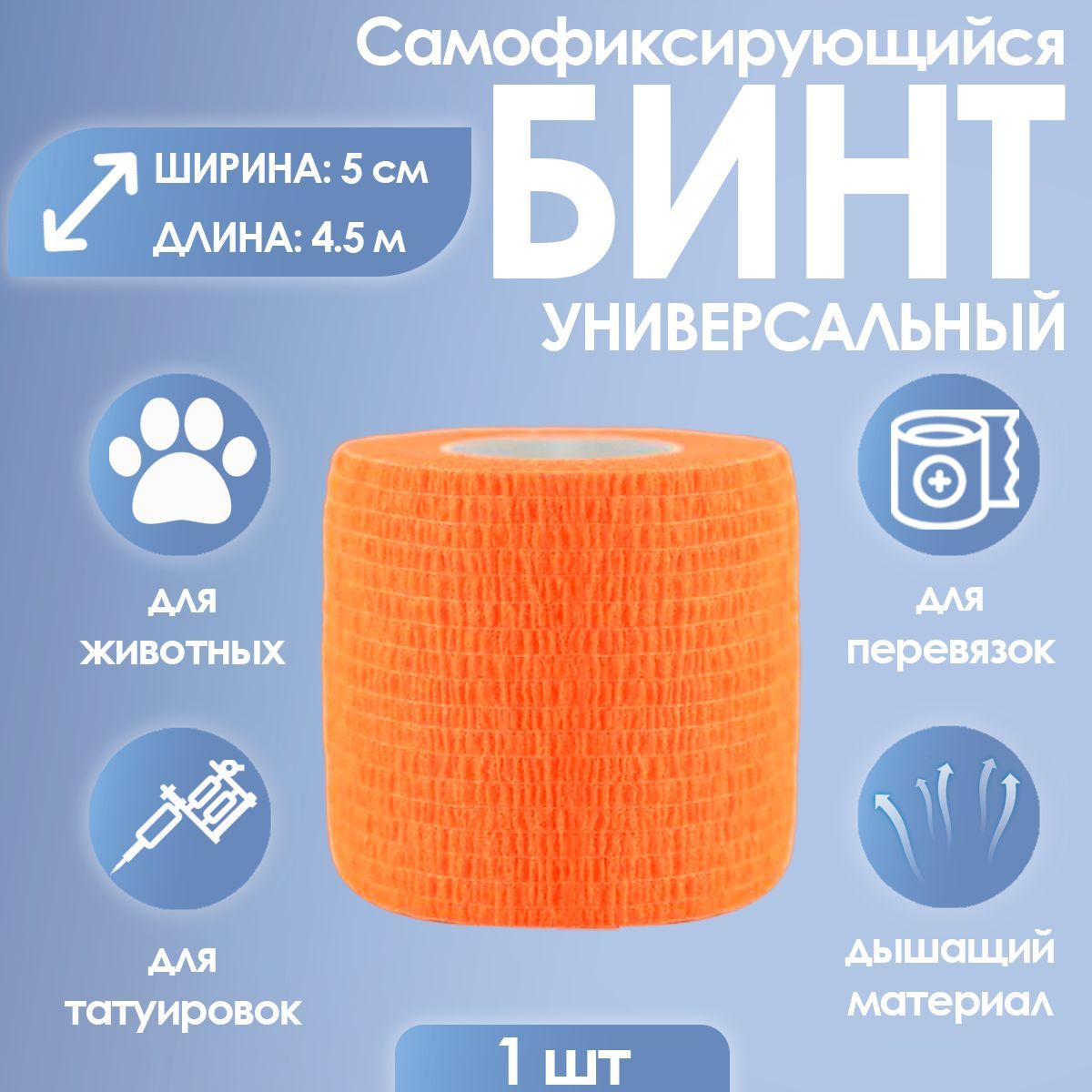 Бинт (бандаж) универсальный эластичный самофиксирующийся, для тату, животных и перевязок, 5см х 450см, оранжевый
