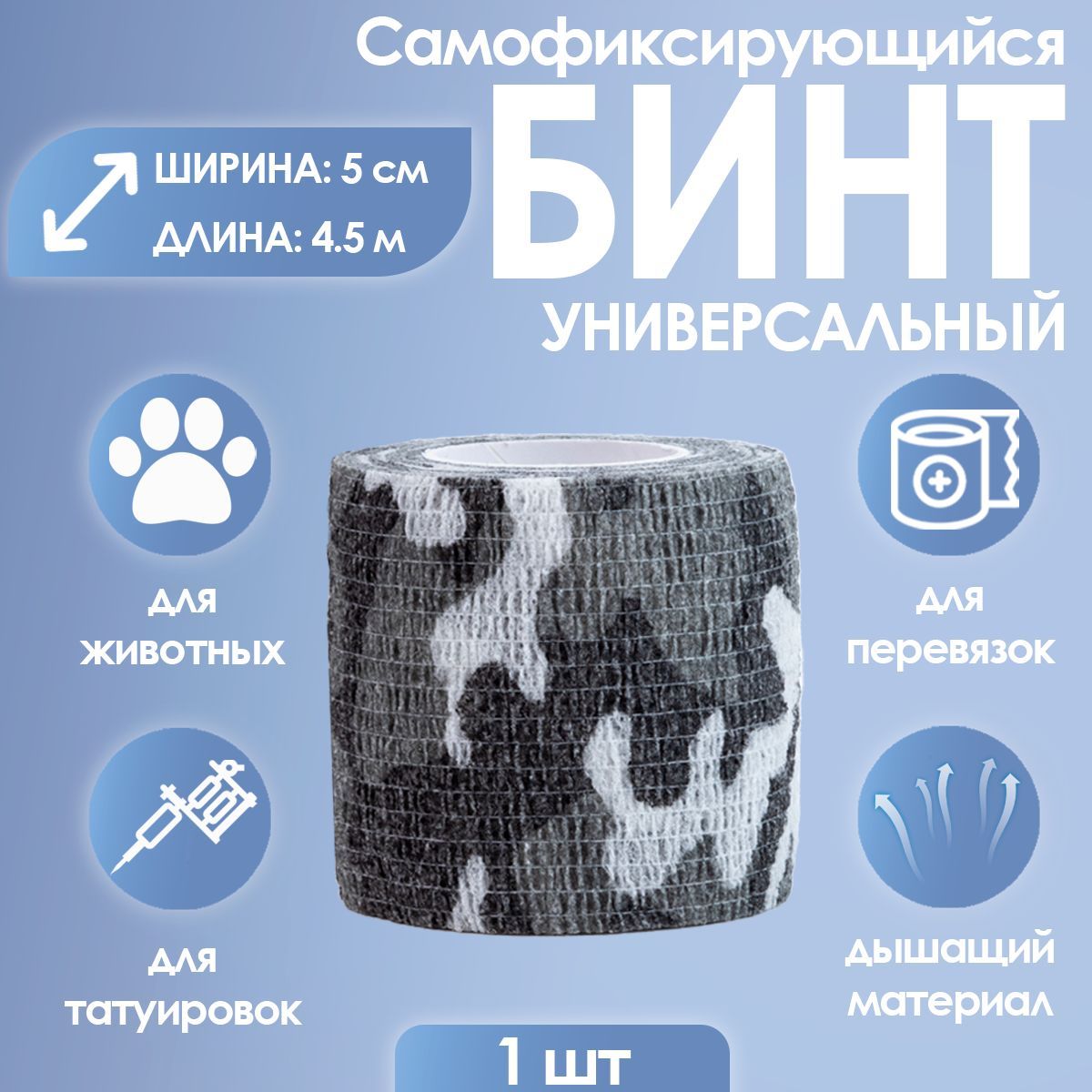 Бинт (бандаж) универсальный эластичный самофиксирующийся, для тату, животных и перевязок, 5см х 450см, серый камуфляж