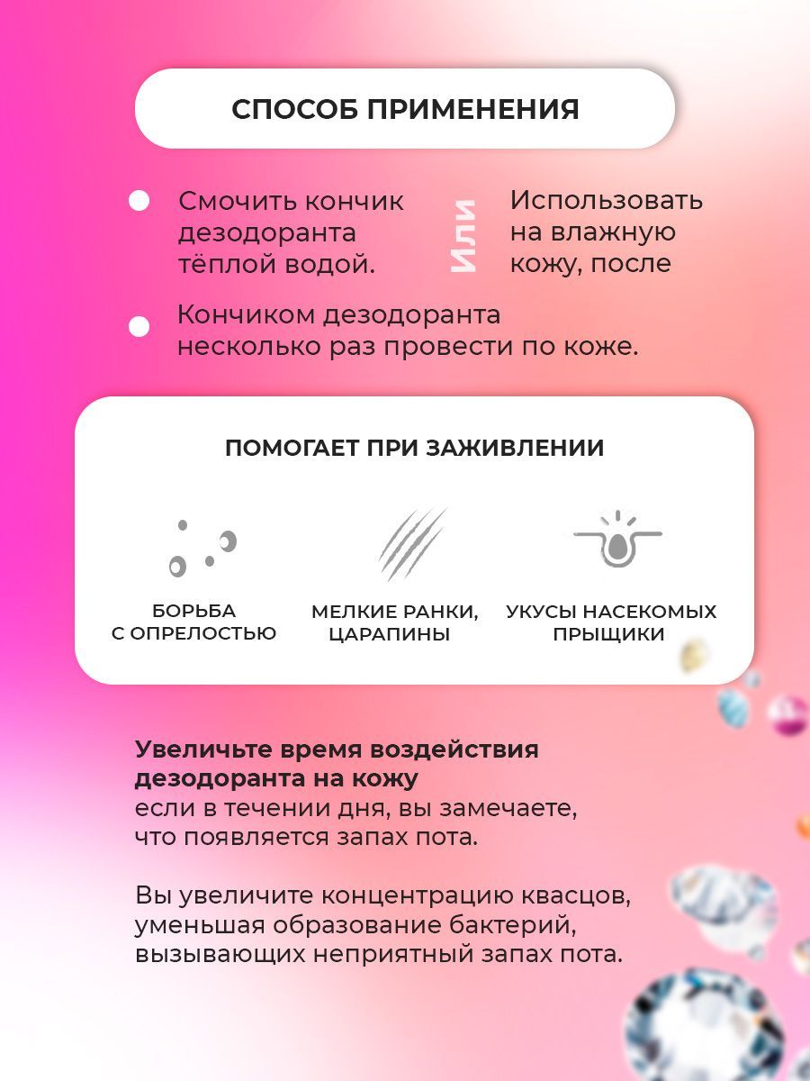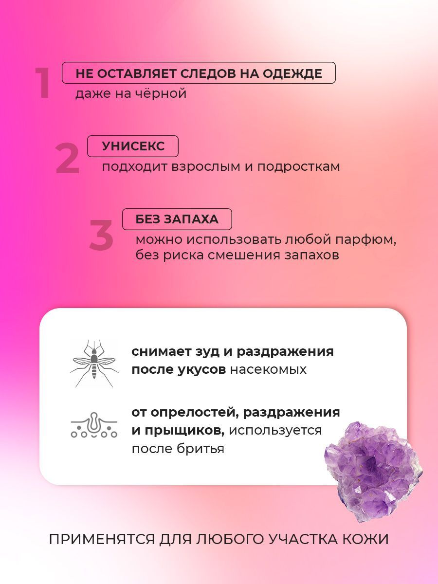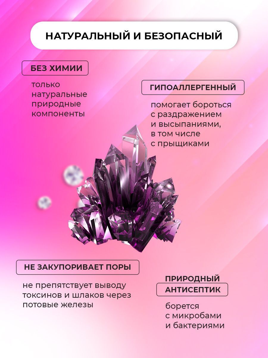 Описание: Минеральный дезодорант кристалл - это натуральный продукт, который содержит алюмокалиевые квасцы в качестве действующего вещества. Именно этот минерал в больших количествах обнаружен в Таиланде, и именно ему обязаны тайцы отсутствием неприятного запаха пота даже в самый жаркий день. Натуральный дезодорант обладает высокой эффективностью в борьбе с неприятным запахом пота и не содержит вредных химических компонентов, которые могут нанести вред здоровью. Преимущества минерального дезодоранта кристалла являются его натуральность и безопасность, что делает его идеальным выбором для тех, кто заботится о своем здоровье и окружающей среде. Его уникальная формула помогает предотвратить появление неприятного запаха и длительное время сохраняет свежесть. Растворяясь в воде кристалл, образует на поверхности кожи тонкий защитный слой, который в течение всего дня эффективно препятствует размножению бактерий, вызывающих неприятный запах. Кристаллический дезодорант имеет множество преимуществ по сравнению с традиционными дезодорантами. Он не оставляет следов на одежде и не вызывает раздражения кожи, как это бывает с некоторыми химическими дезодорантами. Не имеет запаха, что даёт возможно использовать любой парфюм без риска смешения ароматов. Кроме того, он не содержит спирта, что позволяет избежать неприятного ощущения жжения на коже. Абсолютно гипоаллергенный, подходит даже самой чувствительной коже. Если вы ищете качественный, эффективный и безопасный дезодорант, то минеральный дезодорант кристалл - это идеальный выбор. Он не только предотвращает неприятный запах пота, но и позволяет вашей коже дышать, сохраняя ее свежесть и здоровье.