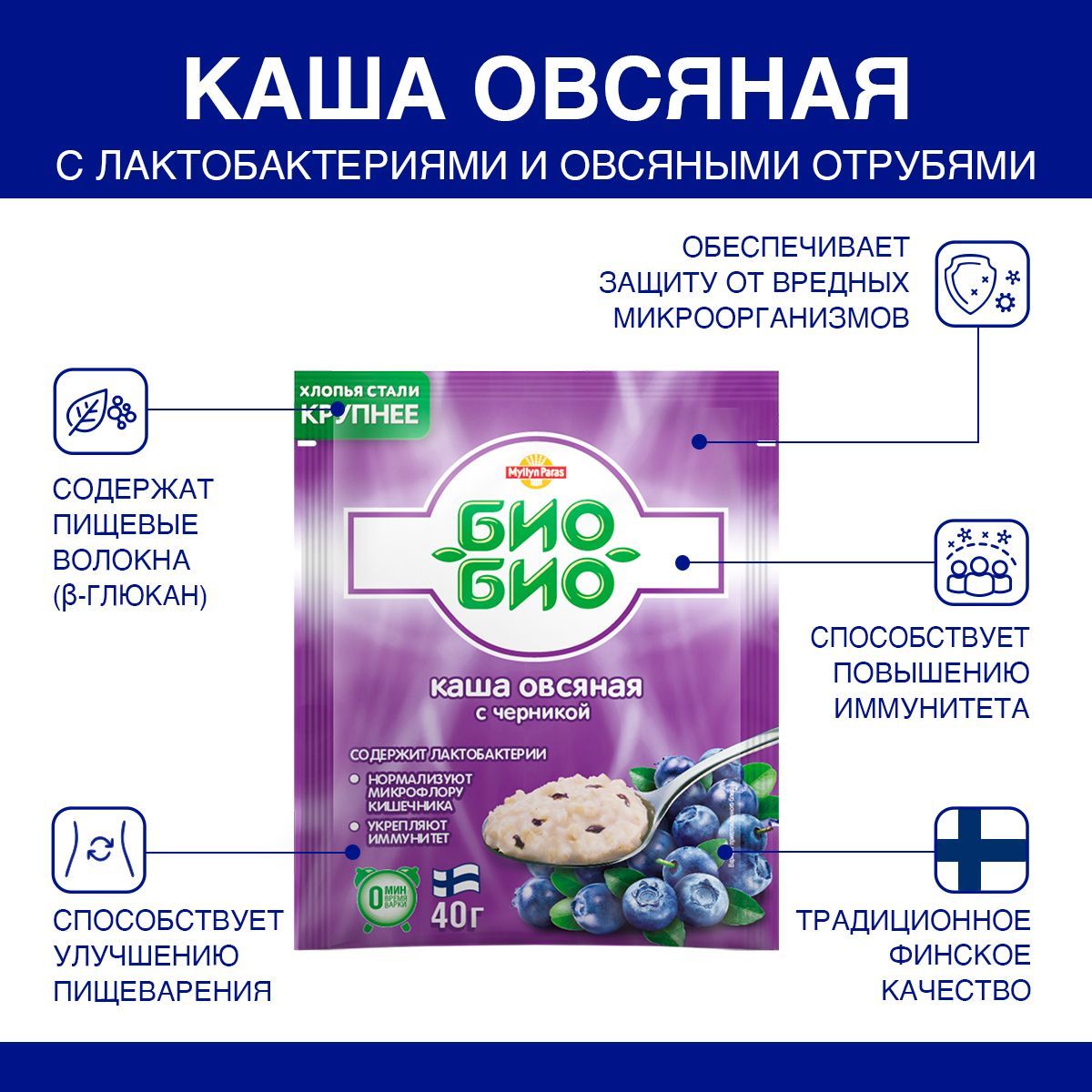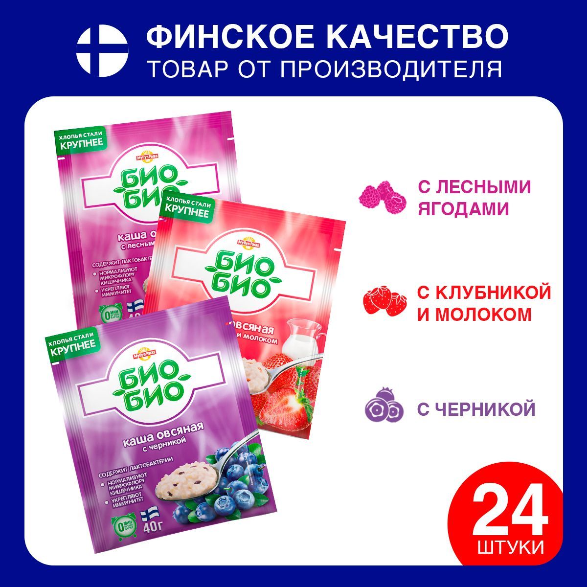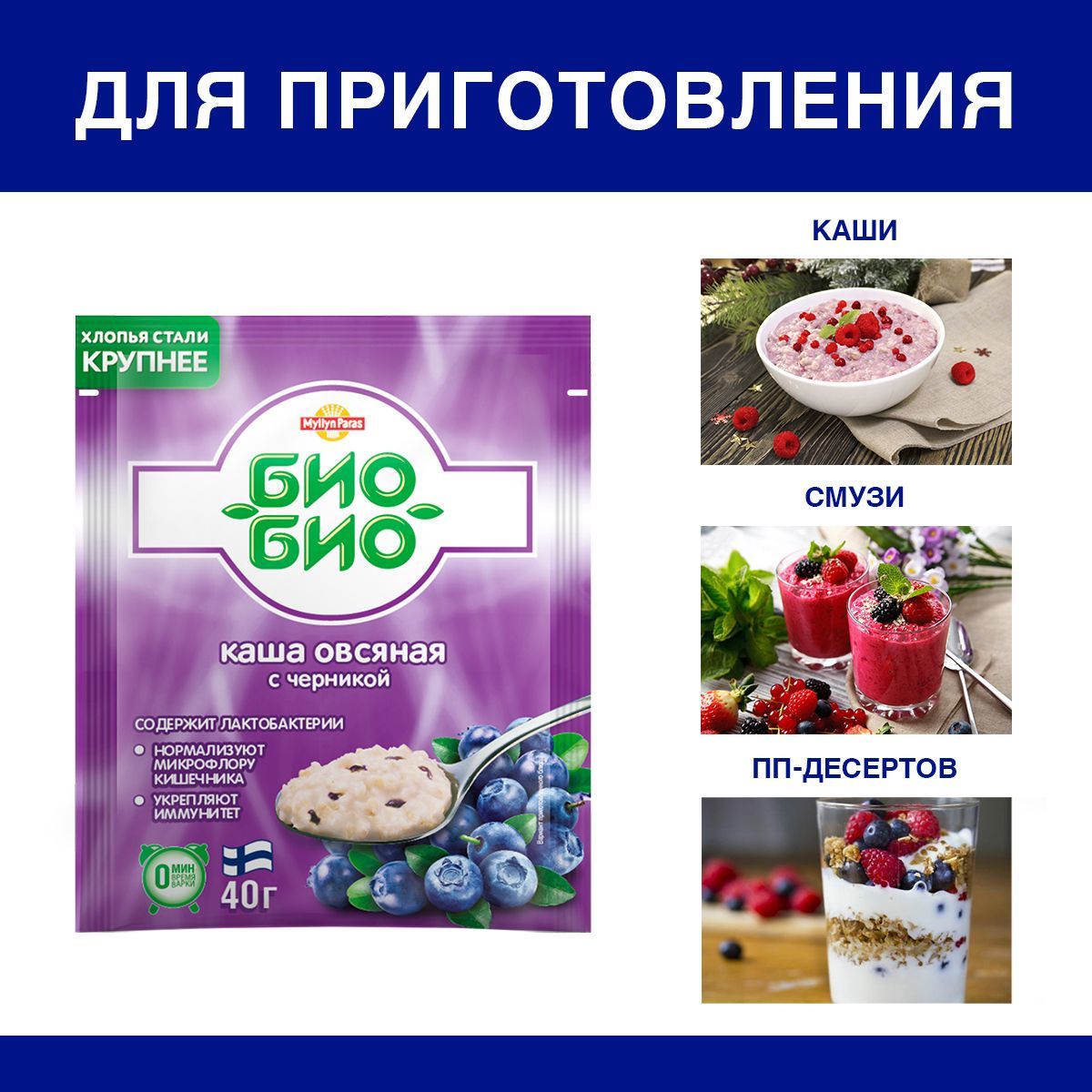 Описание: Вкусный и полезный завтрак с финскими кашами Myllyn ParasФинское качество овсяных продуктов Myllyn Paras90-летняя экспертиза финского качестваС 1928 года семейная компания Myllyn Paras поддерживает традиционное финское качество. Каши Myllyn Paras - основа здорового питания для всей семьиКаши Myllyn Paras - основа здорового питания для всей семьиОвсяная каша "Био-Био" с пробиотическими лактобактериями АССОРТИ инновационный продукт финской компании Myllyn Paras. Овсяная каша с черникой, с клубникой и молоком и лесными ягодами - блюдо для сытного завтрака, полезного обеда и питательного перекуса. Каши быстрого приготовления.