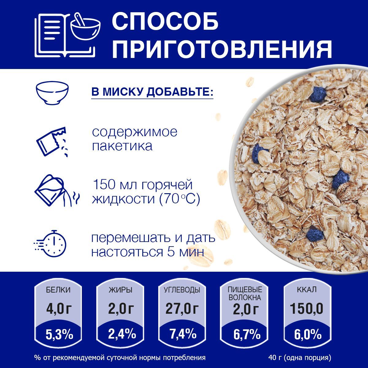 Изготавливается из овсяной крупы расплющенной в овсяные хлопья с добавлением ягод черники и лактобактерий. Хлопья для завтрака. Хлопья фитнес. Каша без варки. Достаточно залить горячей жидкостью до 70 градусов. Каша овсяная в пакетиках - внутри картонной упаковки находится 24 пакетика с кашей на завтрак по 40 г - готовая порция на 1 человека. Подходит для здорового завтрака современной семьи и для тех, кто заботится о здоровье близких.