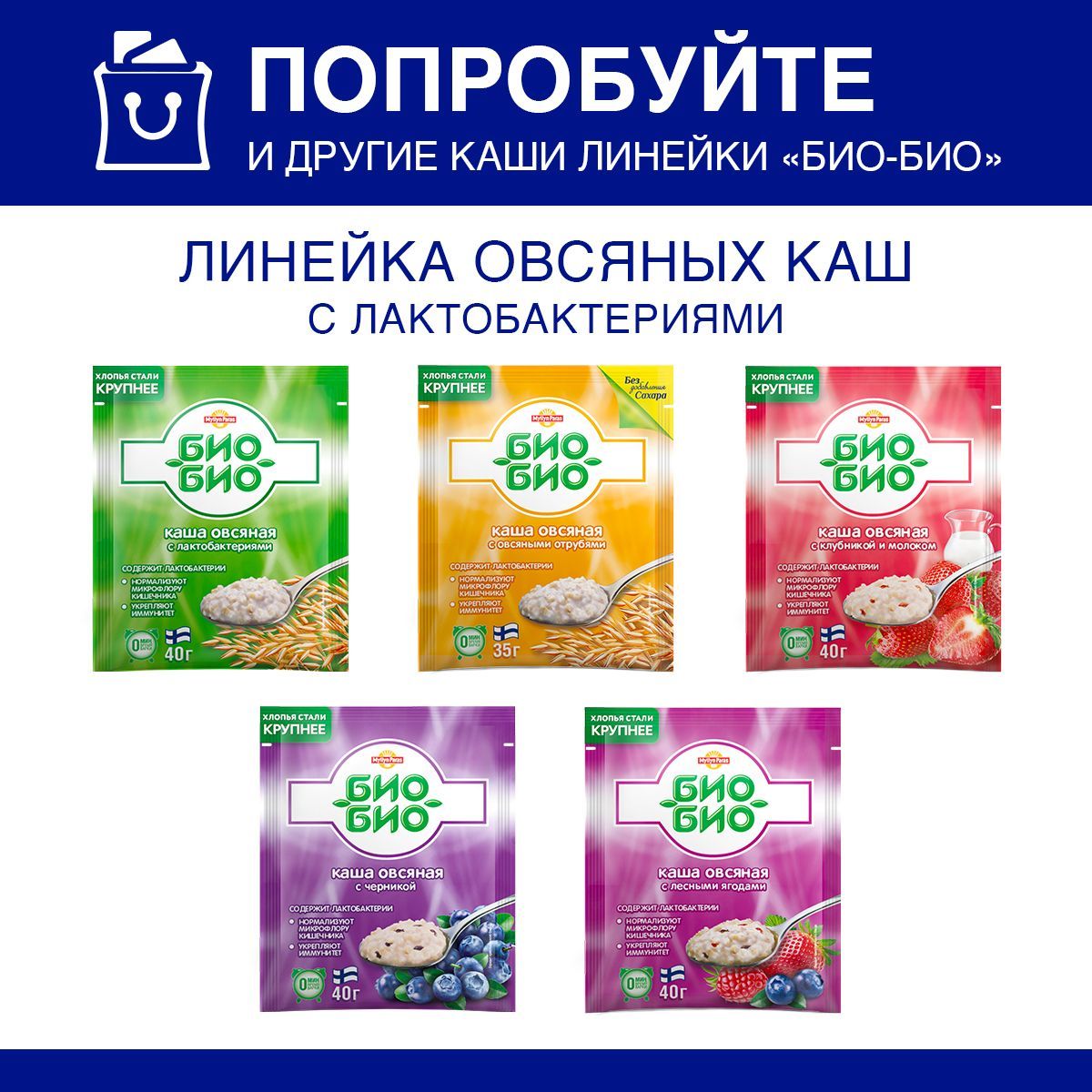 Из овсяной каши "Био-Био" Myllyn Paras можно приготовить вкуснейший овсяный коктейль, смузи или ленивую овсянку в банке. Кашу можно заливать кефиром или растительным молоком на ночь. Попробуйте все овсяные каши с лактобактериями из ассортиментной линейки "Био-Био": с лесными ягодами, с черникой и молоком, с овсяными отрубями, классическая каша с сахаром. Каша "Био-Био" Myllyn Paras обязательно должна быть в вашем здоровом меню.Экологический подход:Экологический подход: забота об окружающей средеКомпания поддерживает экологически чистые технологии в отношении упаковки и производства. Каши для тех, кто следит за фигуройКаши Myllyn Paras для мам и детейКаши Myllyn Paras для бабушек и дедушек