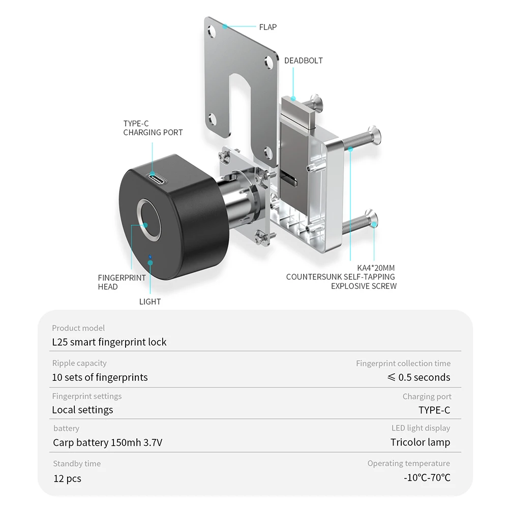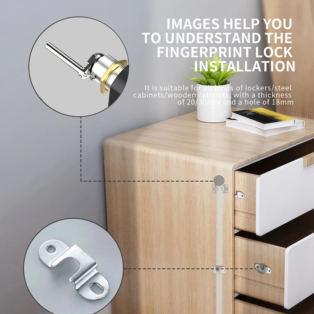 5. Удобная установка:Замок отпечатков пальцев ящика небольшой и легкий, удобный для переноски, простой в эксплуатации и простой в установке.