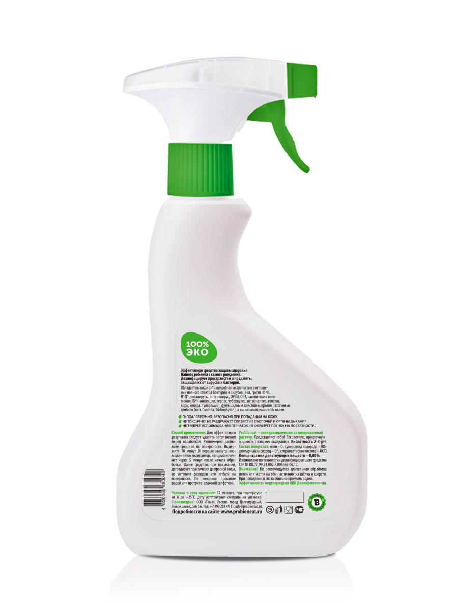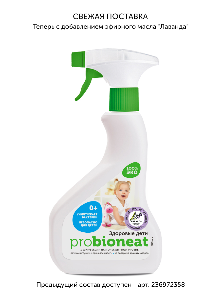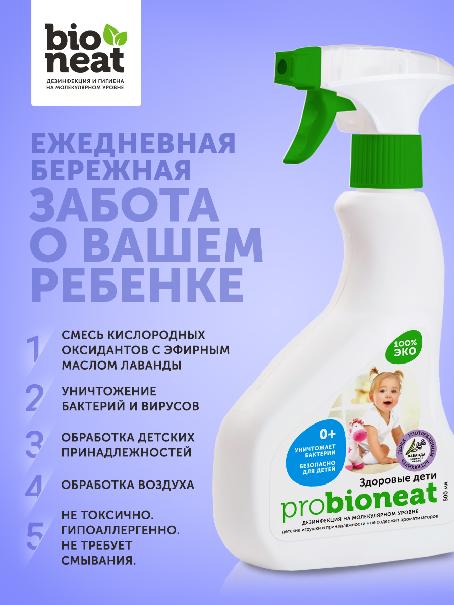 Описание: Bioneat. Средство для дезинфекции и обработки детских игрушек и принадлежностей, воздуха, рук, предметов, поверхностей. Действует на молекулярном уровне. Продукт электрохимии. 100% Эко. Можно использовать в увлажнителях воздуха. Обладает высокой антимикробной активностью в отношении бактерий и вирусов (вкл ОРВИ, грипп H5N1, H1N1, "атипичная" пневмония, туберкулез, гепатит, герпес, ротавирус, энтеровирус, аденовирус, Коксаки), патогенных грибов (вкл Candida, Trichophyton). В составе смесь высоко-активированных оксидантов кислородного содержания (озон, атомарный кислород, супероксид водорода, хлорноватистая кислота, молекулярный кислород) с добавлением эфирного масла лаванды. Не требует смывания, не оставляет пленок на поверхности. Деактивируется практически до воды. Не содержит ароматизаторов и отдушек. Абсолютно безопасно для детей и животных. Не раздражает органы дыхания, не вызывает аллергии, не требует средств защиты. Кислотность нейтральная 7-8 pH. Товар сертифицирован.