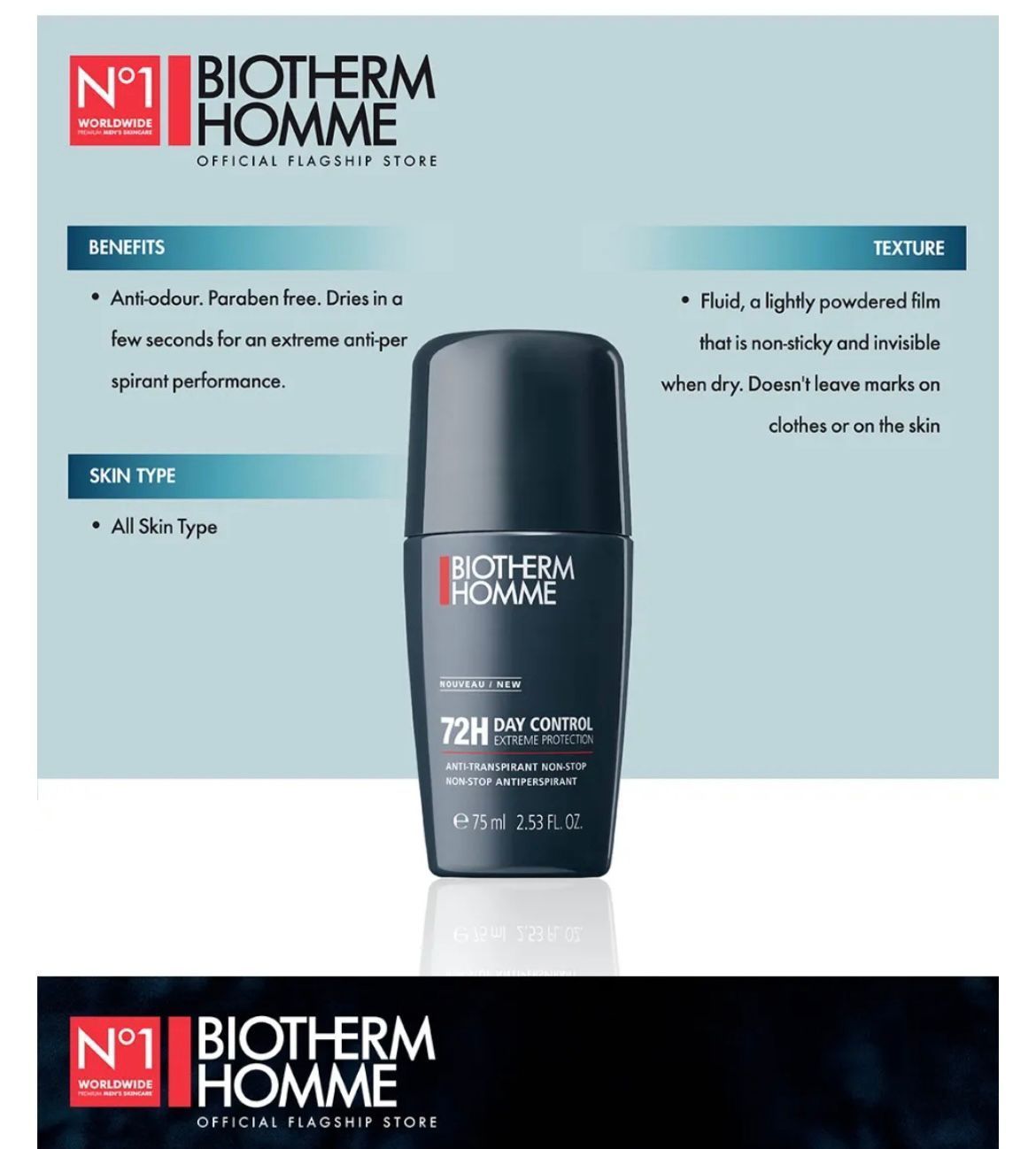 Описание: Дезодорант ролик для мужчин Biotherm 72 H DAY CONTROL — EXTREME PROTECTION — это эффективное средство, которое активно действует на кожу деликатных участков до 72 часов.