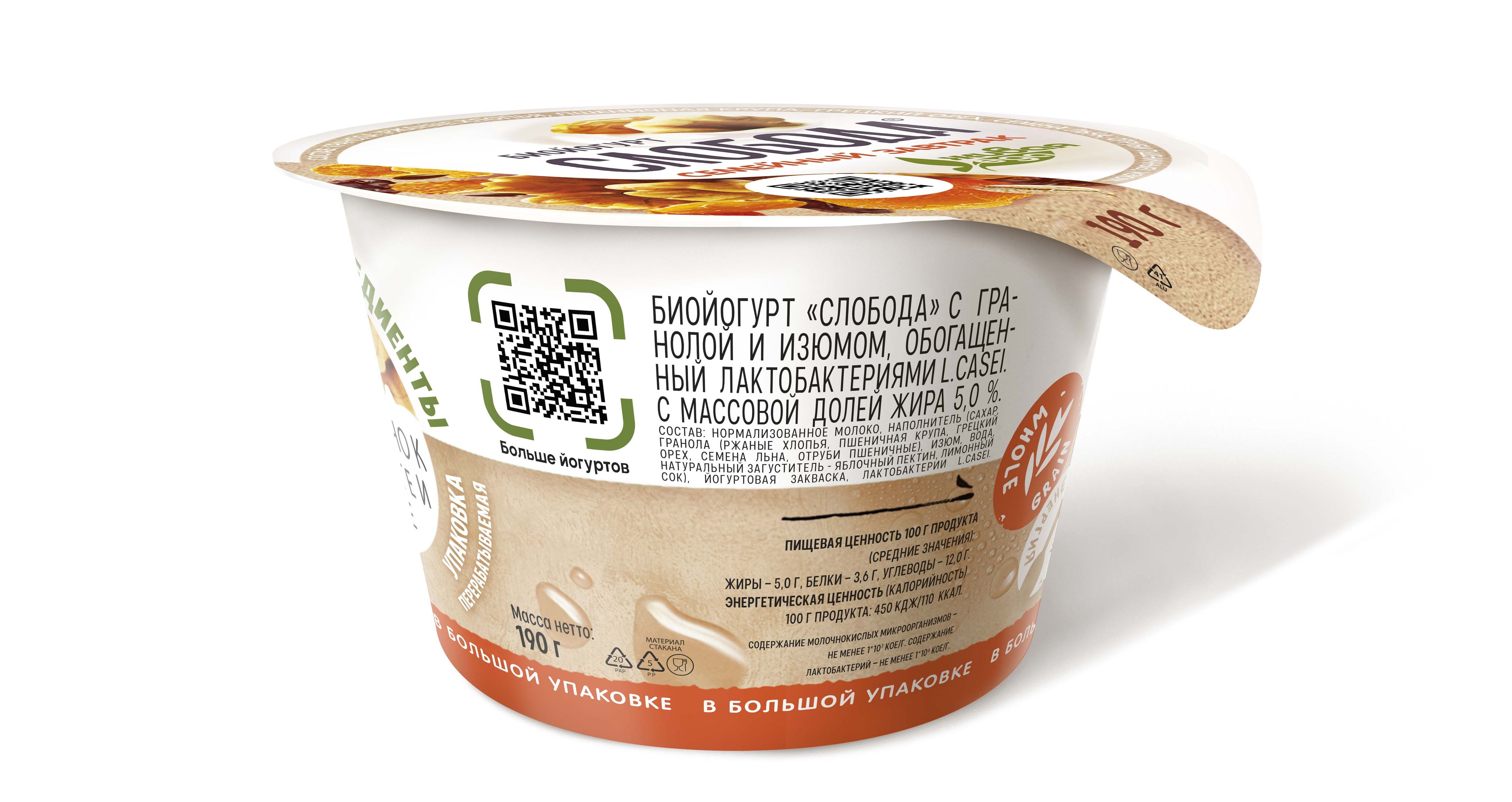 Биойогурт Слобода "Семейный завтрак" с гранолой и изюмом, 5%, 190 г