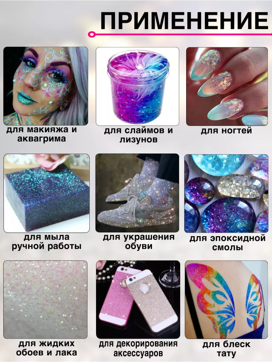 Комплектация Блестки в баночках 4 шт; пакет зип лок; картонная коробка