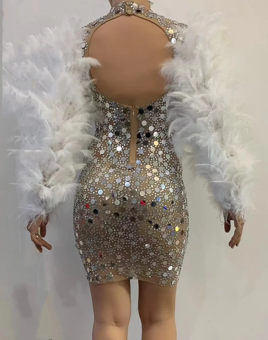 Блестящее Серебряное платье с блестками и перьями, женское платье для празднования дня рождения, свадьбы, бара, латиновые платья, танцевальные платья, нестандартное мини-платье с перьями