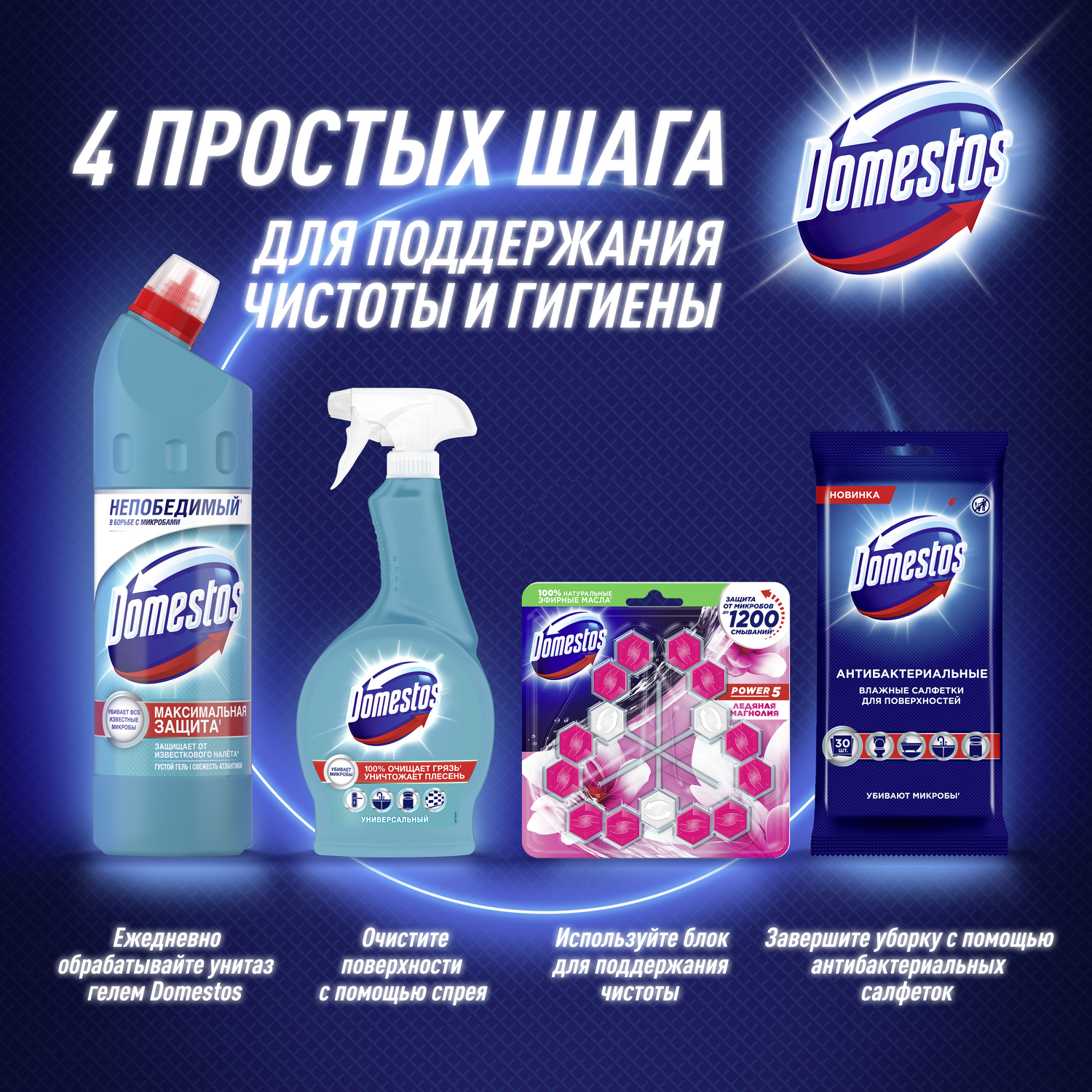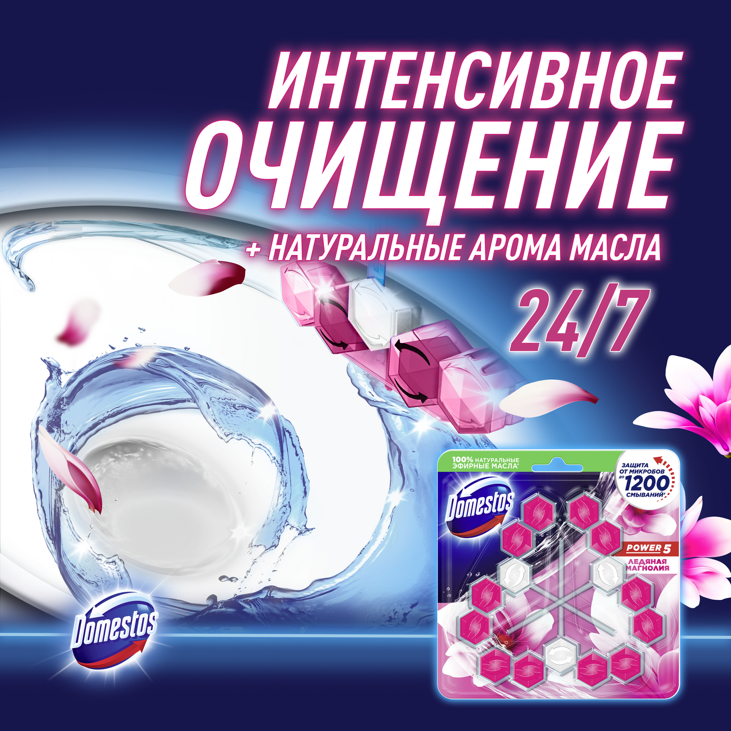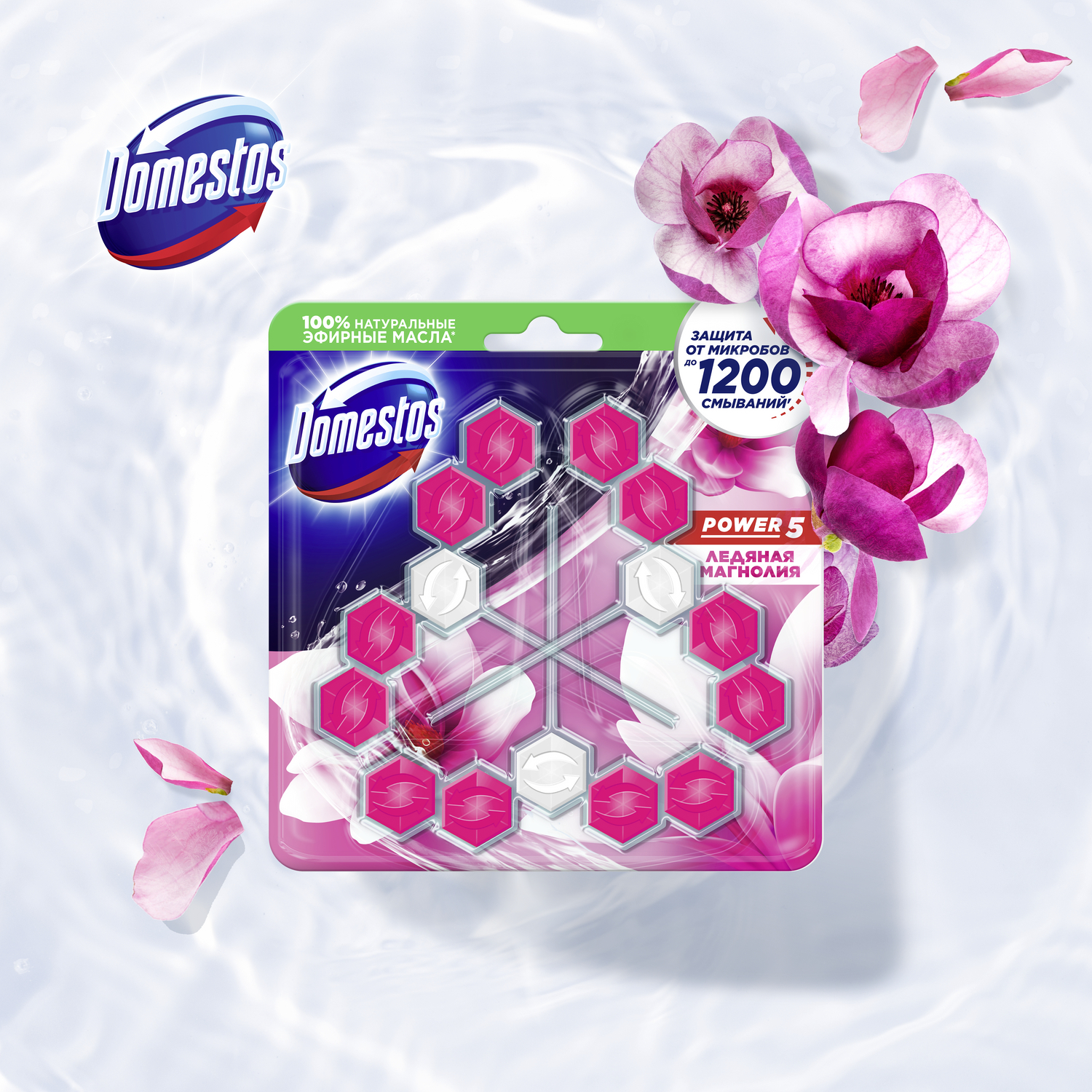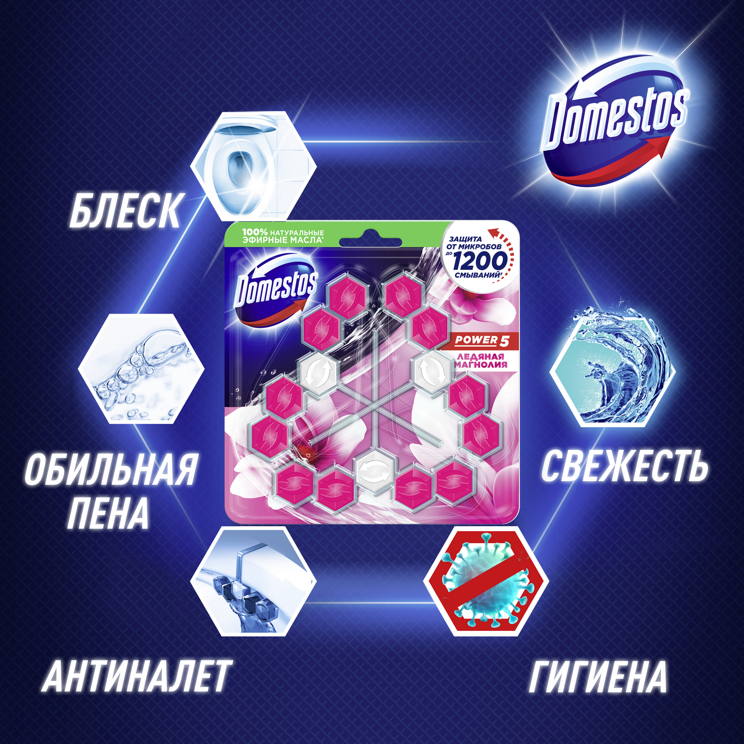 Описание: Блок для очищения туалета Domestos Power 5 Trio Ледяная магнолия против известкового налета и неприятного запаха — это пять преимуществ, помогающих обеспечить защиту от загрязнений и микробов и сохранить чистоту и блеск. При каждом смывании появляется свежий аромат магнолии на срок до 4 часов и обильная пена, которая борется с налетом, поддерживая гигиену и блеск поверхности унитаза.Блок для очищения унитаза Доместос содержит активное средство, которое под действием напора воды ополаскивает всю поверхность унитаза, защищая от бактерий и помогая предотвращать известковый налет.Блок для туалета Domestos Power 5 Trio Ледяная магнолия:-предотвращает известковый налет;-борется с неприятными запахами;-удаляет грязь и микробы обильной пеной;-оставляет приятный аромат после смывания;-содержит 3 сменных блока в одной упаковке;-работает до 1,5 раз дольше*.Как использовать туалетный блок? Вскройте пластиковую упаковку, достаньте блок и поместите под ободок унитаза в место наиболее сильного потока воды с помощью держателя. По окончании использования Доместос Power 5 Trio Ледяная магнолия выбросите его в мусорное ведро и установите запасной блок из упаковки. Используйте в сочетании с другими моющими средствами Доместос: ЭКО гелем и универсальным спреем, чтобы поддерживать чистоту во всем доме.Продукция Domestos представлена в разных сегментах рынка средств для уборки: чистящие гели, туалетные блоки, универсальные спреи, антибактериальные салфетки. Domestos убивает все известные микробы, помогая обеспечить гигиену дома. На сегодняшний день Domestos уверенно занимает одну из лидирующих позиций** на рынке чистящих средств.*По результатам тестов Unilever по сравнению со стикером для очищения унитаза Domestos.**Источник: AC Nielsen, в денежном выражении, категория бытовой химии, Россия, Апрель 2016 — Март 2017.