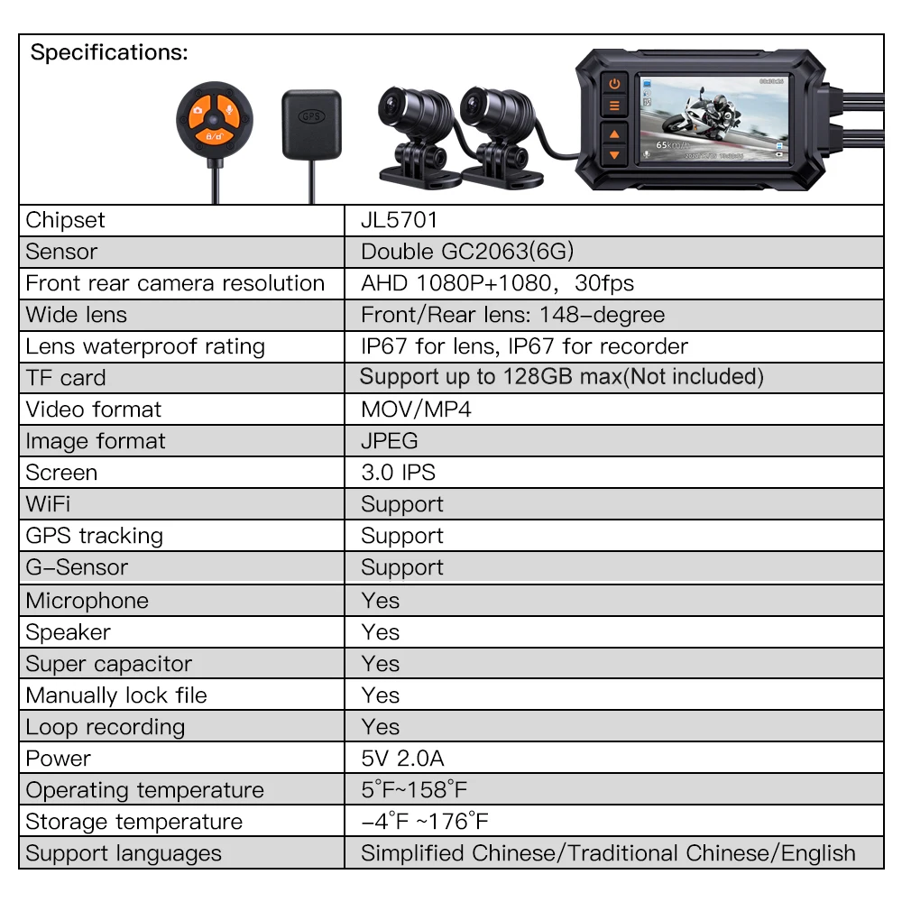 Видеорегистратор Sportbike подключен к включению/выключению зажигания, а питание подается непосредственно от аккумулятора мотоцикла или поддерживает блок питания (проверьте только перед установкой). Поддержка циклической записи, не беспокойтесь о пропущенных важных моментах, карта Micro SD до 256 ГБ (SD-карта в комплект не входит)